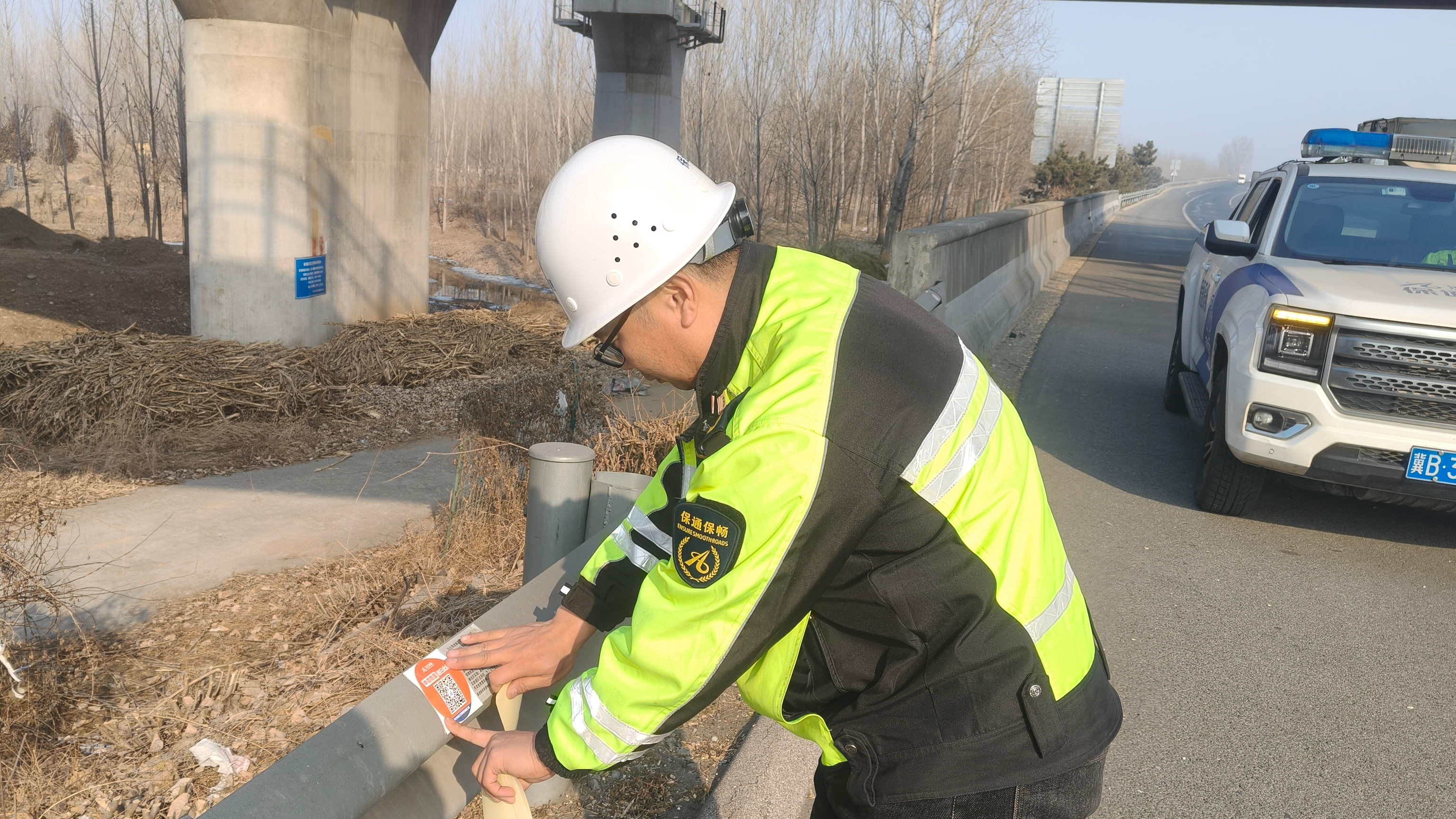 为确保新版二维码规范落地、高效可用,分公司指挥调度中心严格对标集团标准推进张贴工作,选用防水反光材质制作新版二维码,保障恶劣天气下清晰可见、经久耐用;张贴过程中,工作人员精准选址,在辖区高速路侧护栏板等易接触且安全的区域全面覆盖,同步对原有旧二维码进行替换覆盖,确保现场标识统一规范、无遗漏无死角。