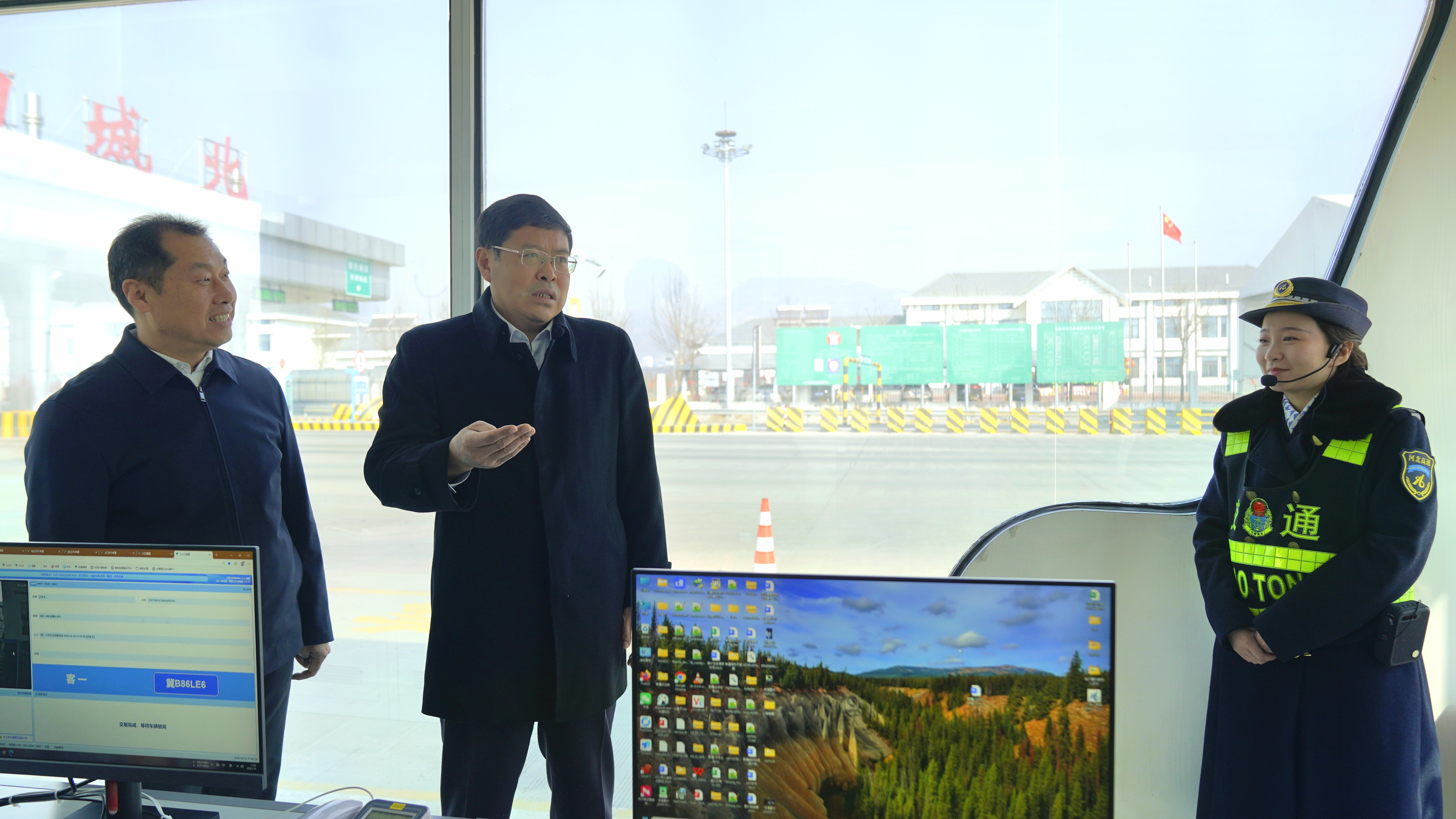 宣国宝在玉田城北收费站实地察看了全场景轻量化智慧收费站建设运行情况,详细询问了人员配置、运营流程及效能提升等情况,亲切慰问了奋战在保通保畅、收费服务、道路养护等岗位的一线职工,并致以诚挚的新春问候;在凤凰顶隧道秦皇岛方向入口,通过观看视频演示、听取讲解的方式,深入了解了隧道桥梁“三区四防”快速封闭管控系统的研发背景、应用场景及实际成效,对该系统在提升应急处置能力、保障运营安全方面发挥的作用给予充分肯定。