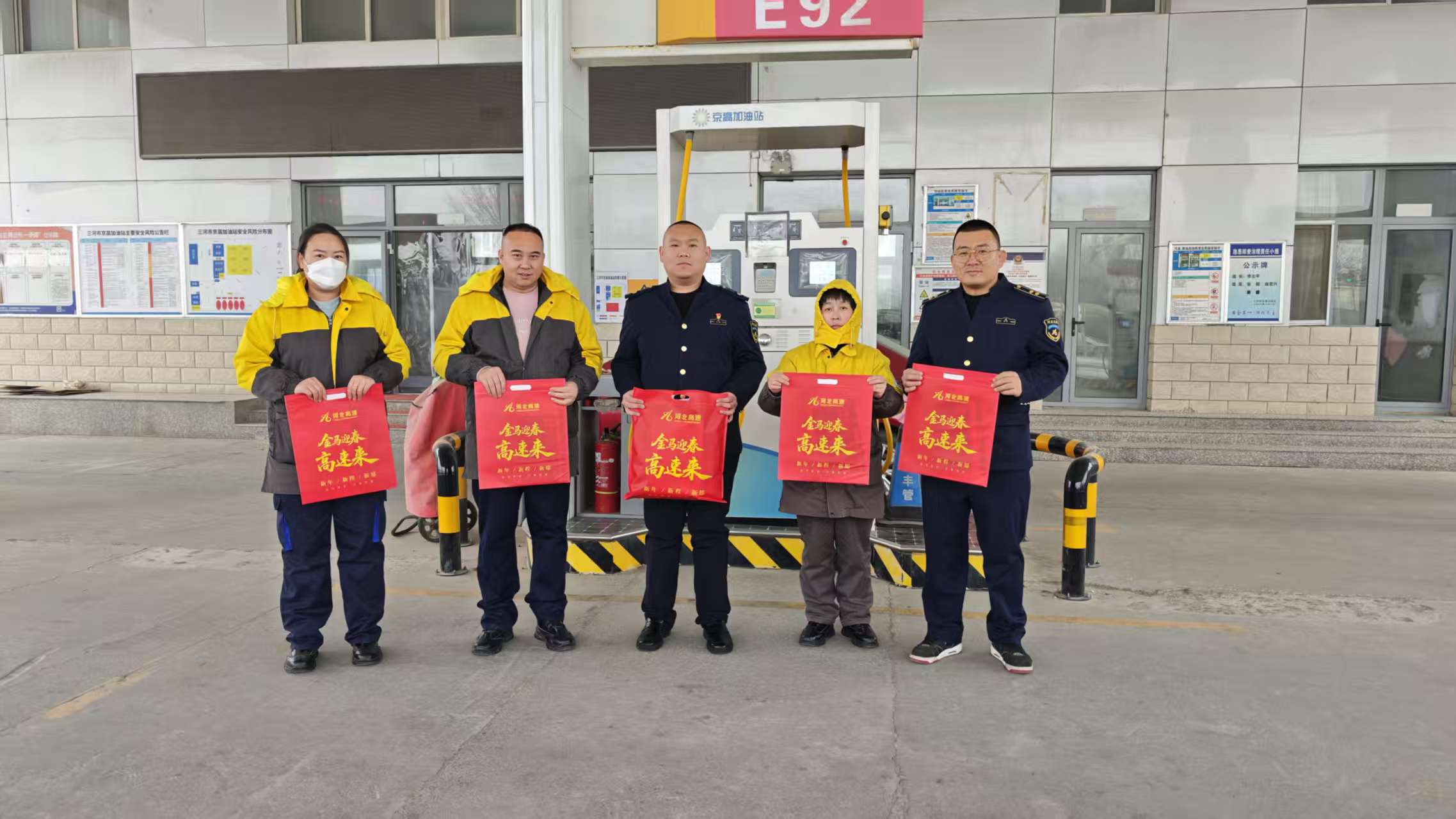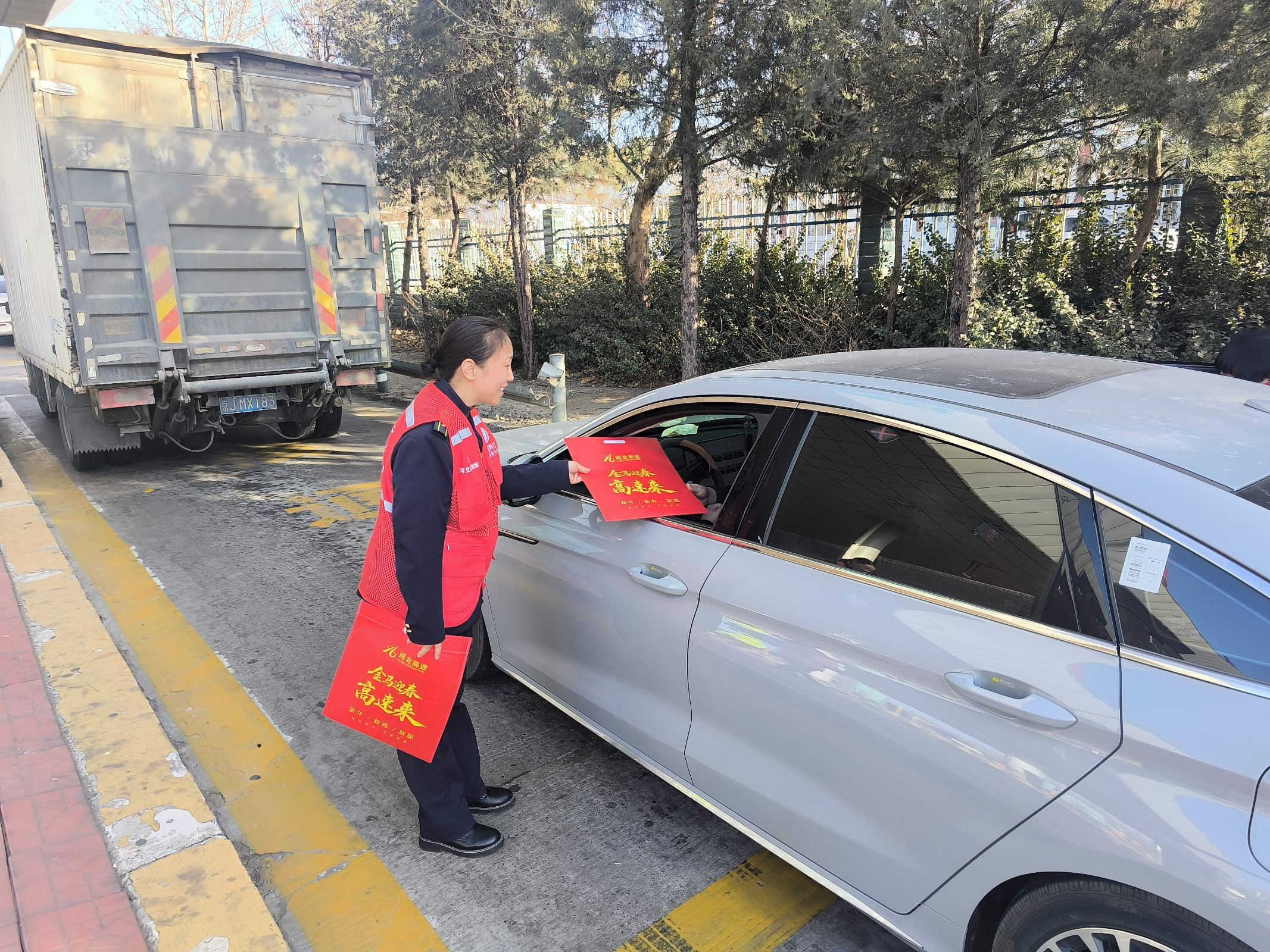 情暖司乘,传递人文关怀。在收费站广场显著位置设置便民服务台,配备热水、简易修车工具等物资,免费提供给有需要的司乘人员,同时,志愿服务小队为司乘送上了包括春联、福字在内的春节礼包。司乘人员感到分外亲切,表示感受到河北高速的热情,很多司乘停车来领取春联和福字,要把祝福带回家。
