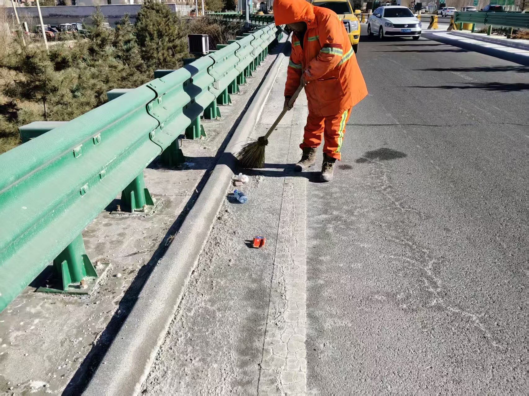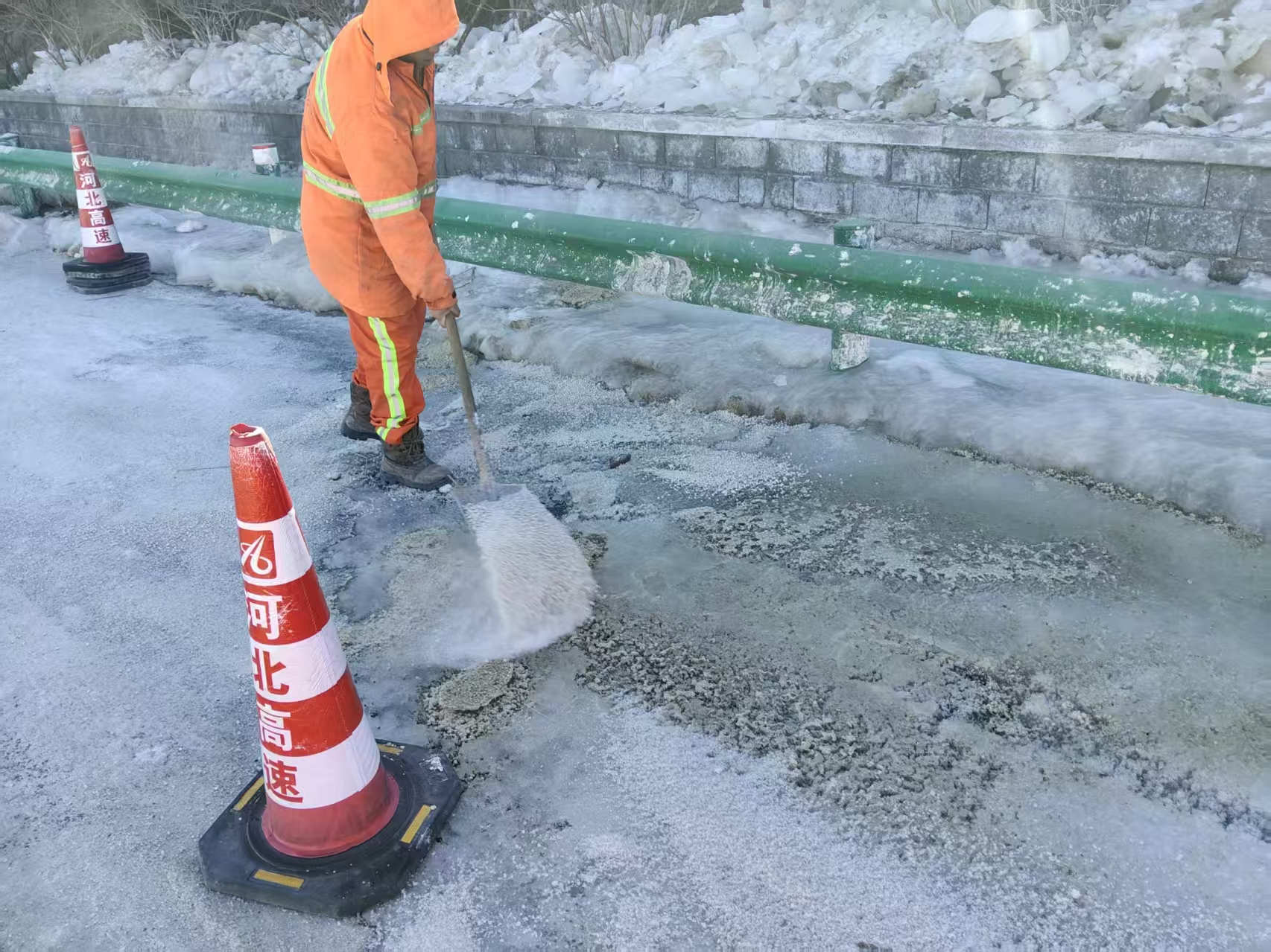 午后气温略有回升,但张承高速承德方向K593 路段背阴处的积冰仍是通行 “拦路虎”。养护队迅速切换 “除冰模式”,融雪剂撒布车精准作业,队员们手持工具徒手清理边角积冰,不放过任何一处结冰死角。作业间隙,巡查车上常备的热水、以备不时之需,用点滴善举为过往旅客送上新春暖意。