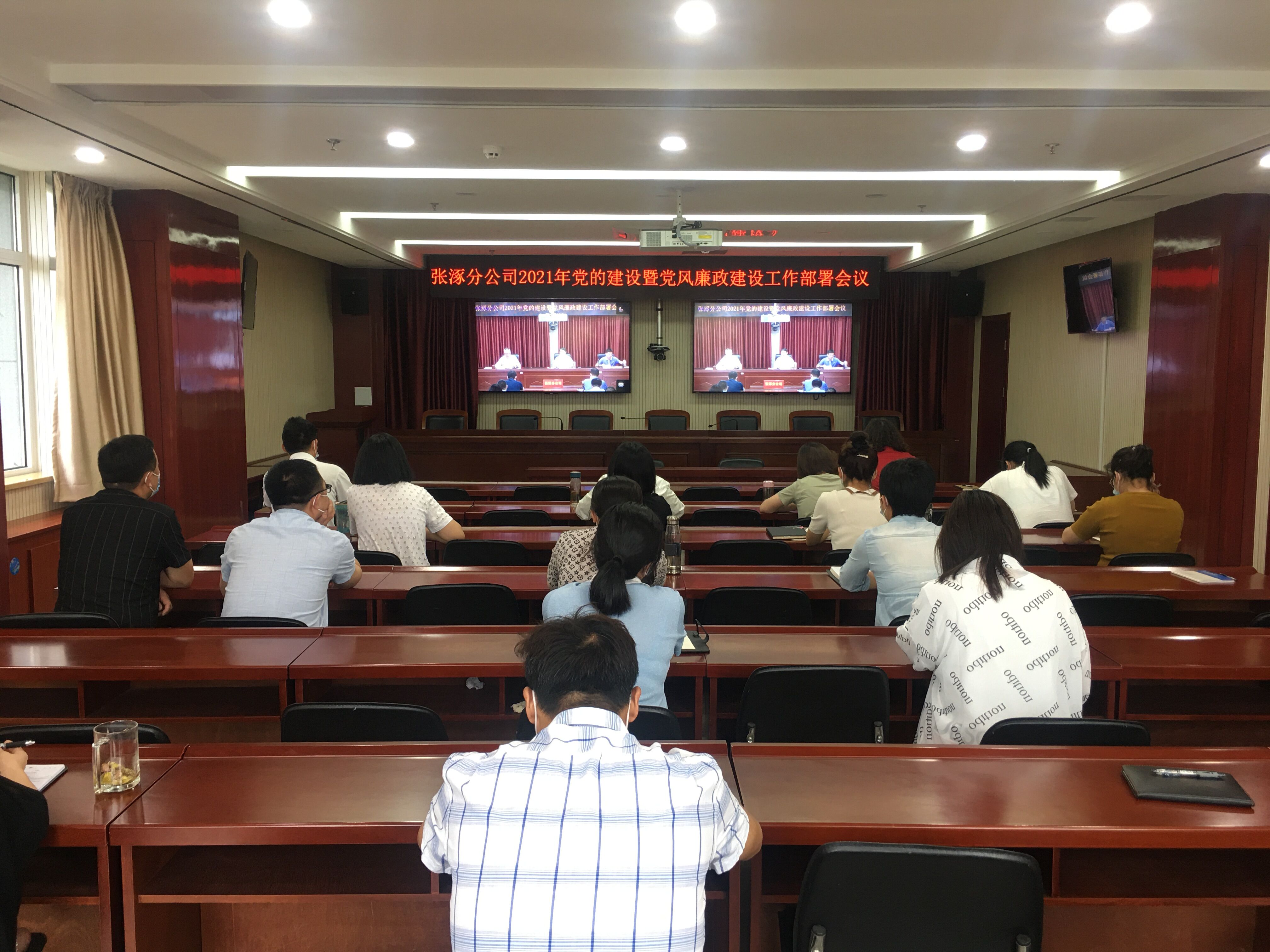 会议以视频会议形式召开。分公司领导班子成员,总部各部室全体人员在主会场参加会议,所属各单位主要负责人、负责人,在岗党员,班(股)长和党风廉政监督员在各单位视频会议室参会。