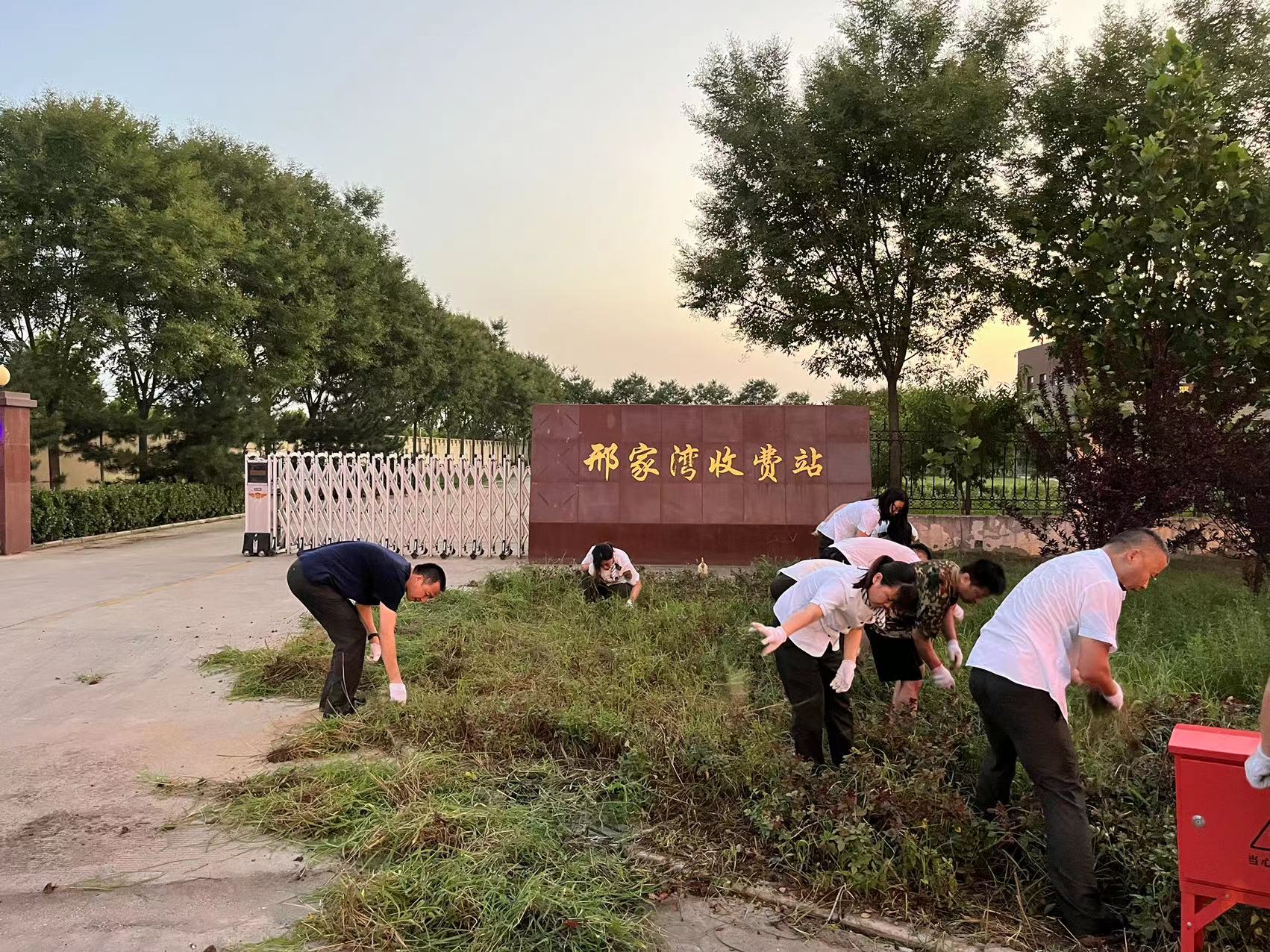 连日阴雨、高温天气,草势疯长,在党支部书记于登攀的带领下,全体干部职工积极参与,不惧高温、不怕苦累,清理杂草、开坑填肥、分工明确且有条不紊。活动现场,大家湿透了衣背,“农忙”的背影加上亮眼的“邢家湾收费站”标牌,俨然成了一道亮丽的风景线。