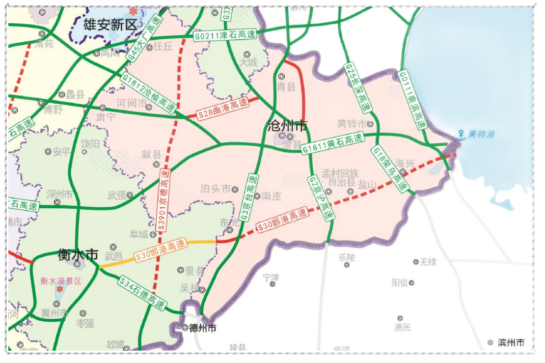 邯港高速沧州段全长124公里,西接邯港高速衡水段,终点在渤海新区与沿海高速枢纽相交,采用双向四车道高速公路标准建设。按衡水沧州界至国道G205段、国道G205至黄骅港段分别立项,投资人按整体一次招标。本项目的规划建设将与邯港高速公路衡水段共同形成一条河北省中南部地区便捷的出海通道,进一步完善河北省高速公路的网络布局。