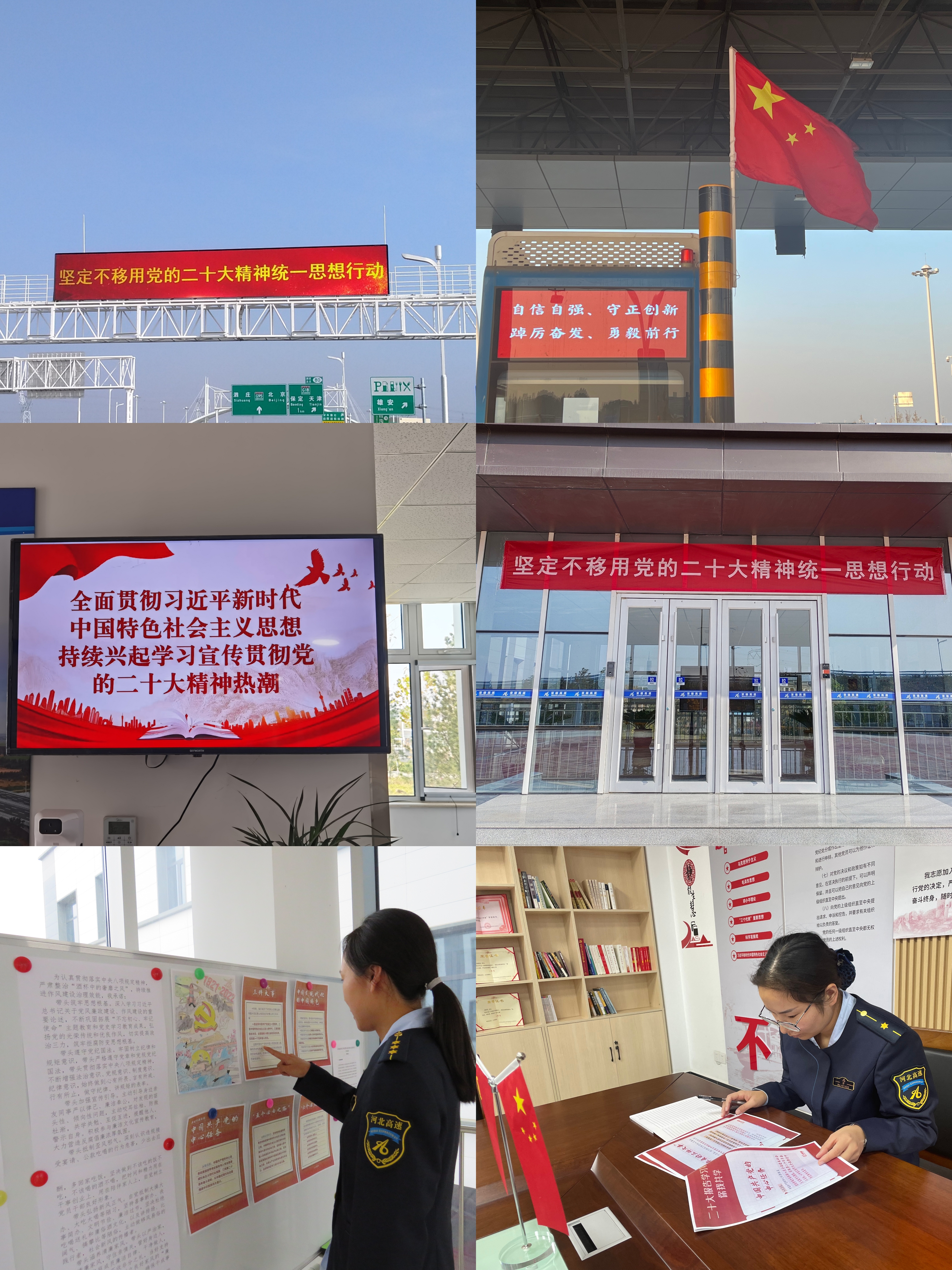 迅速部署落实,着力抓好氛围营造。认真落实集团公司《关于进一步营造学习宣传贯彻党的二十大精神浓厚氛围的通知》要求,充分认识氛围营造工作的极端重要性和紧迫性,以“时时放心不下”的政治责任感抓细抓实。聚焦高速沿线、收费广场、服务窗口、办公场所等重要领域,充分利用可变情报板、车道显示屏、宣传条幅、公示栏、展板等宣传阵地,及时全面展示学习宣传贯彻党的二十大精神宣传标语100余处,并安排专人进行巡查监督,确保内容版式规范、更新及时,以高标准、严要求、实举措确保宣传贯彻取得良好效果。