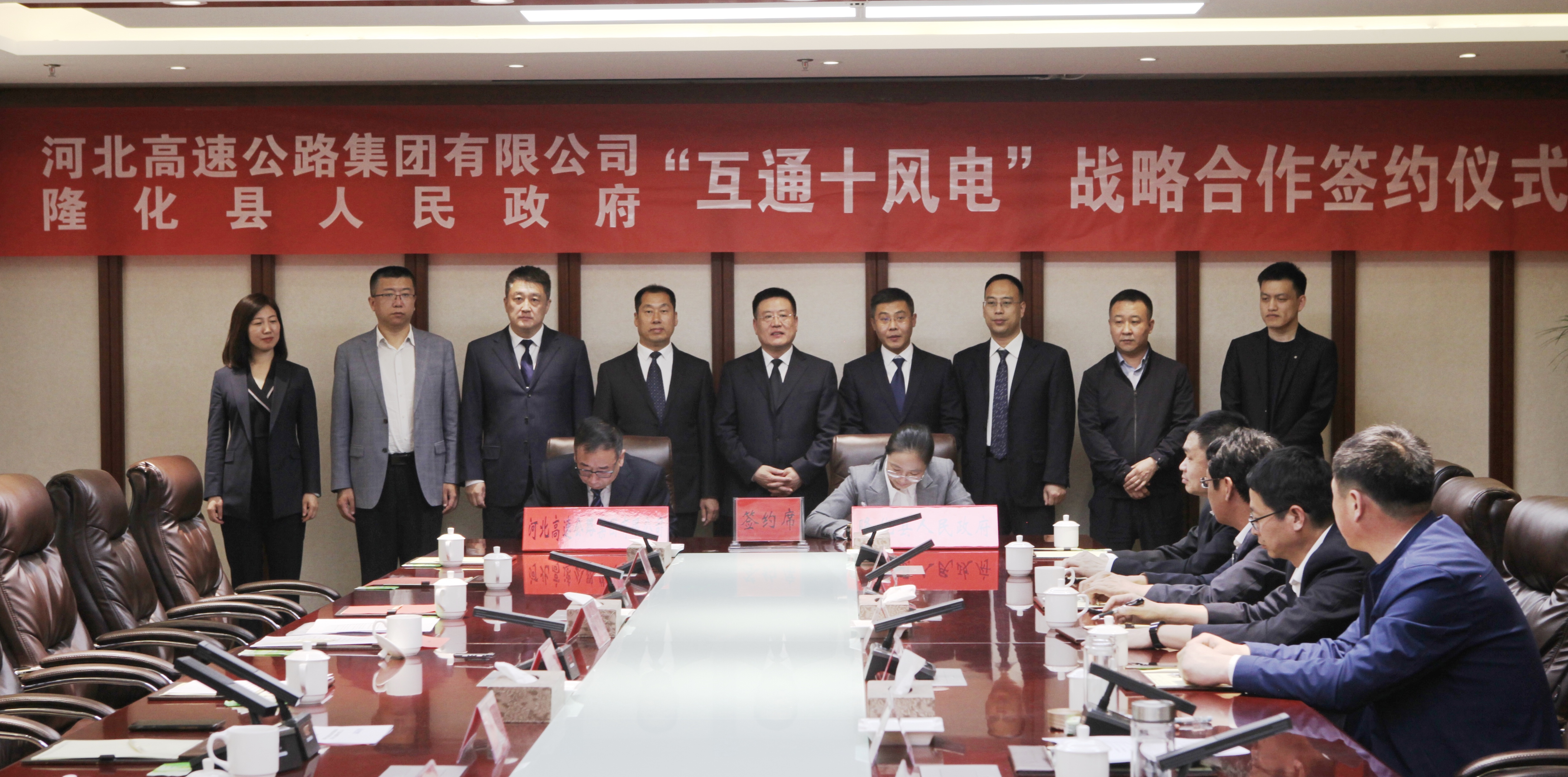 签约现场,集团公司总经理助理、承德分公司党委书记彭敬之与隆化县县长杨琳,分别代表河北高速集团、隆化县人民政府签署了"互通+风电"战略合作框架协议。