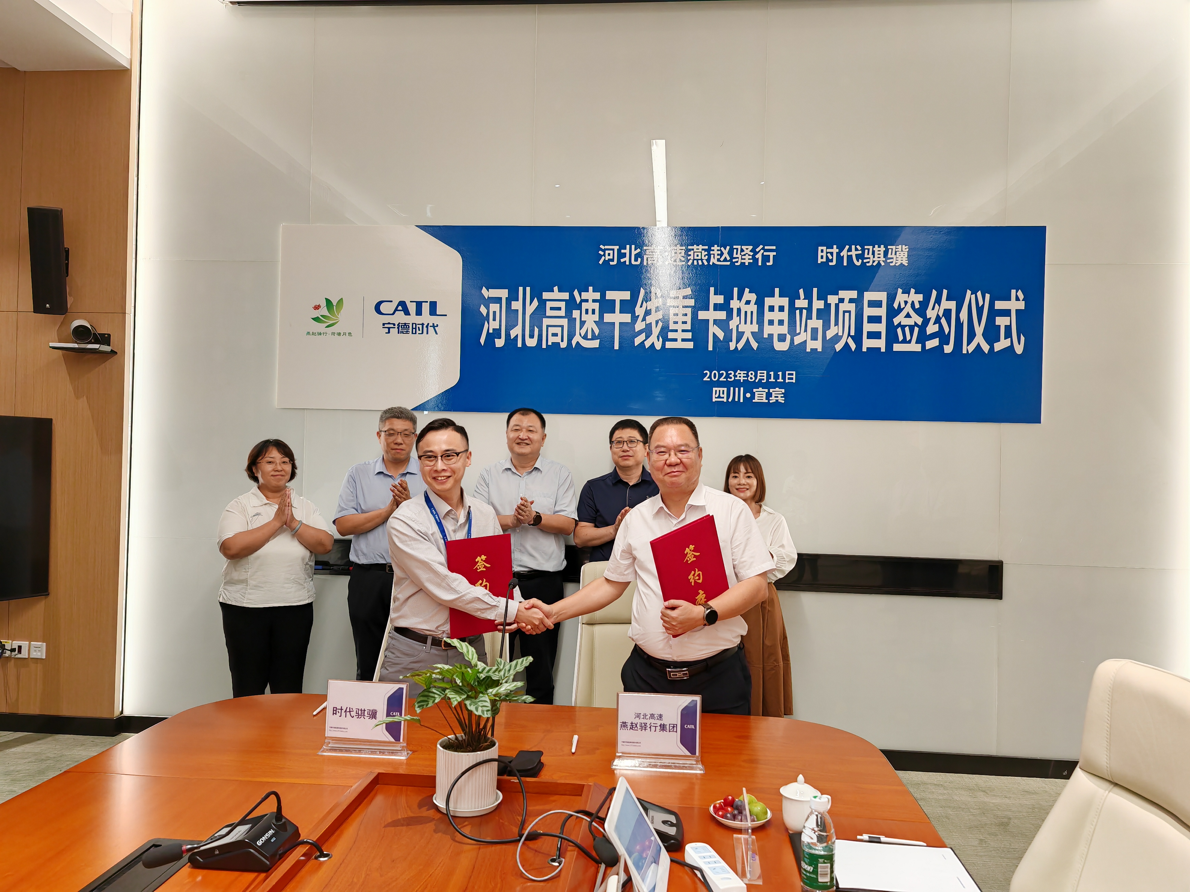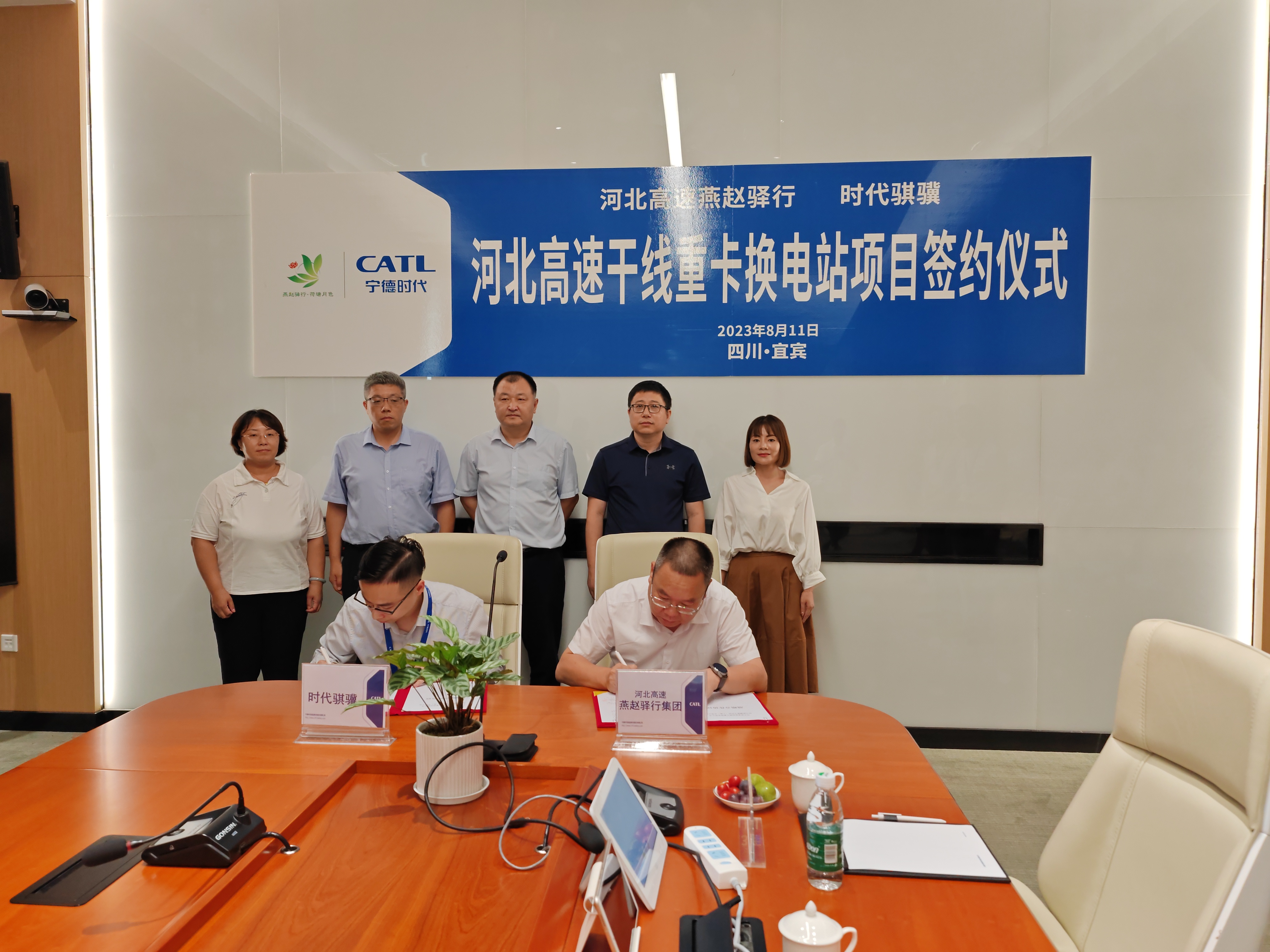 8月11日,河北高速燕赵驿行集团有限公司与宁德时代旗下时代骐骥数字科技(上海)有限公司在四川省宜宾市举行河北高速干线重卡换电站项目签约仪式。燕赵驿行集团党委书记、董事长董辉,党委副书记、副董事长、总经理郝颖,时代骐骥总经理朱正良、副总经理陈端雄等参加签约仪式。