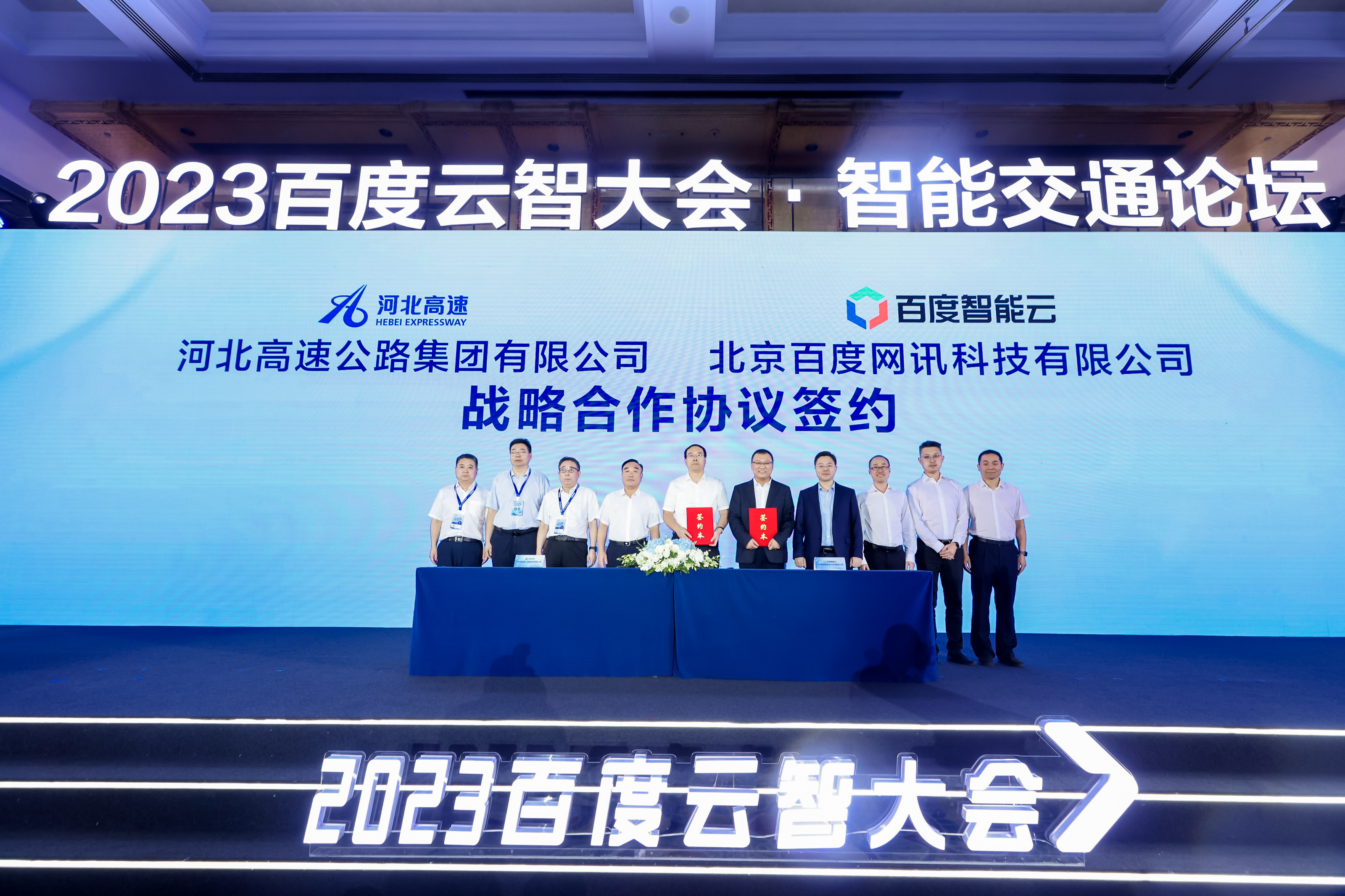 9月5日,由北京市经济和信息化局指导、百度智能云主办的2023百度云智大会在北京举办。河北高速集团受邀参加本次活动,并与北京百度网讯科技有限公司签订战略合作协议。集团公司党委副书记、副董事长、总经理杨荣博,百度集团执行副总裁、百度智能云事业群总裁沈抖出席见证签约,集团公司副总经理韩澄宇,百度副总裁、百度智能交通事业部总经理石清华签订合作协议。