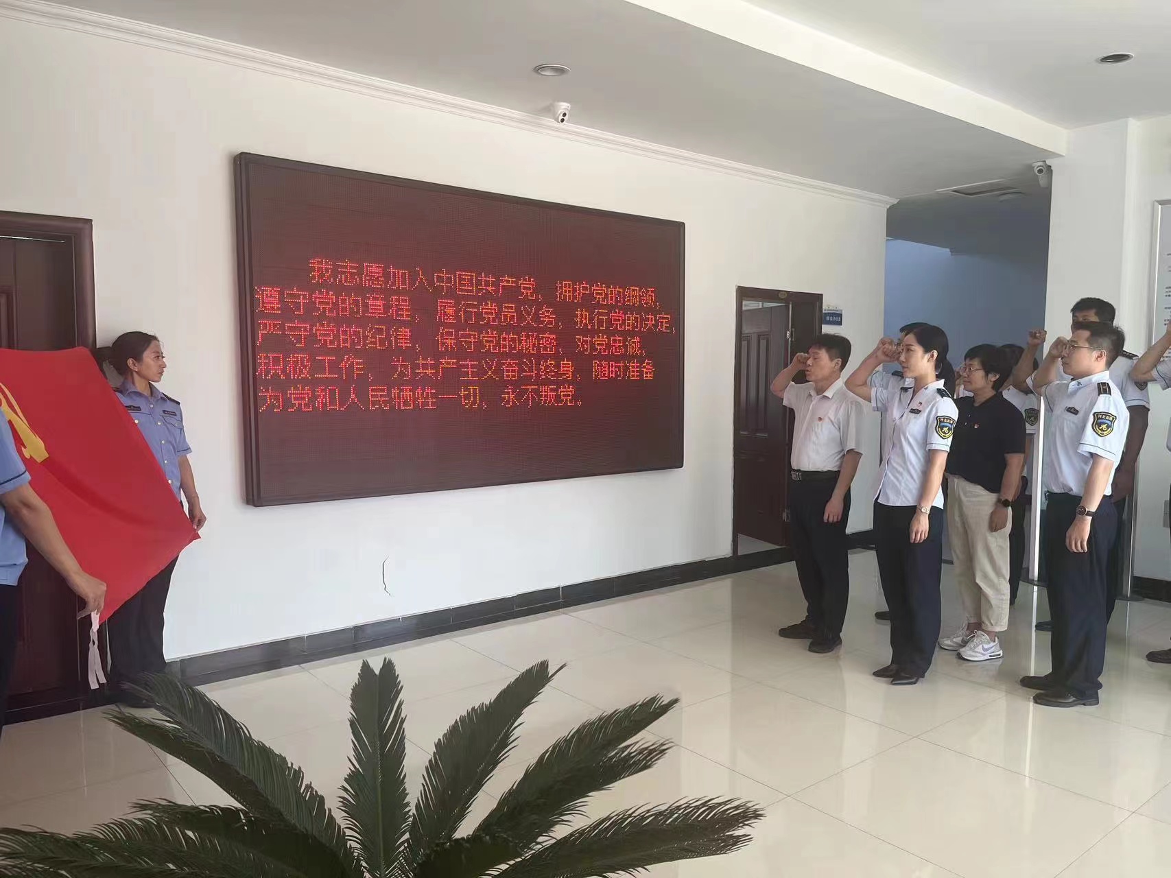 活动开始前,全体党员汇聚在一楼活动大厅里,面向党旗,庄严肃立,高举右手郑重宣誓。一字一句,重温入党誓词,许下铮铮誓言,展示支部全体党员的责任与担当。宣誓结束后,大家在会议室一起诵读新修订的《中国共产党章程》,通过“支部书记领读,全体党员复读”的方式,重温党的历史和宗旨。同时,集中学习了习近平总书记《论党的自我革命》一书中部分篇目。通过系列学习,进一步提振了党员的精气神和自豪感,加深了党员对党的纲领的理解,强化了党员意识,坚定了初心和使命,使党员进一步严明纪律规矩,强化自我约束,时刻保持先进性。
