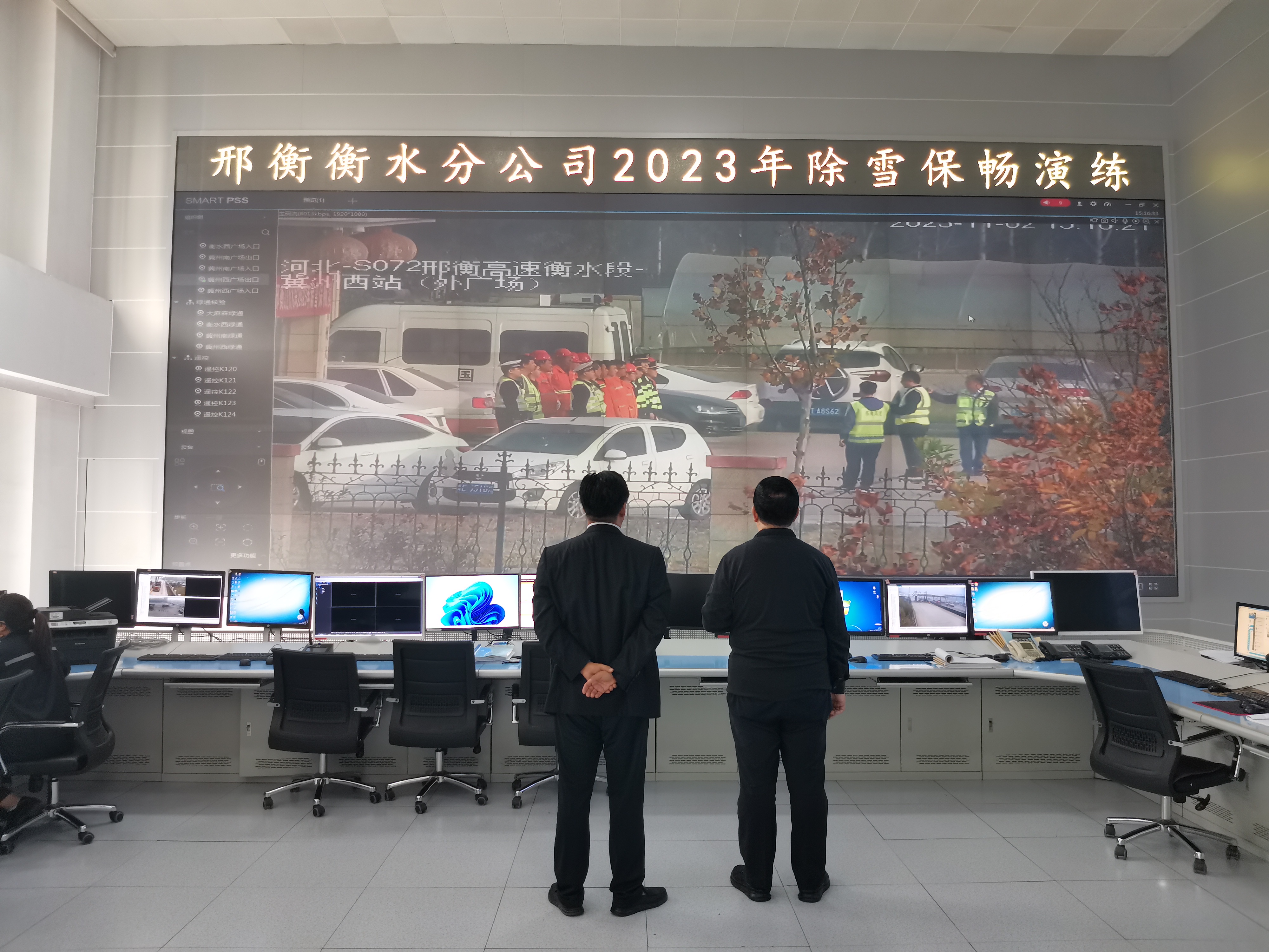 本次演练于下午15点在冀州西收费站外广场进行,模拟庄子头养护班组管养路段出现降雪天气,道路出现积雪,对道路正常通行造成安全隐患。分公司除雪保畅应急工作领导小组经分析研判,决定立即启动除雪保畅Ⅳ级预警,协调交警、路政、除雪保畅人员进行除雪作业。总指挥马进会进驻监控中心指导演练工作。
