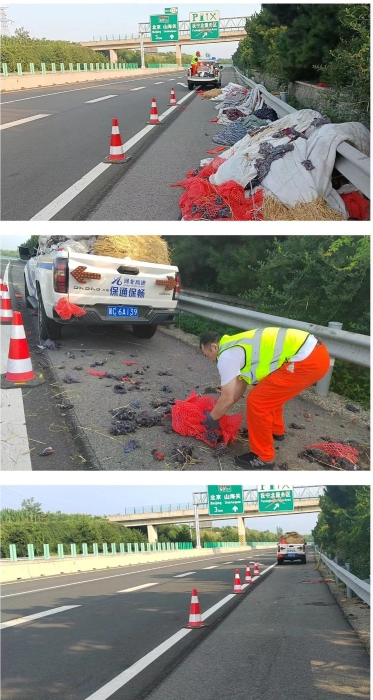 6点16分抚宁北中队到达现场,按照《道路清障作业规范》做好防护后迅速开启“清洁模式”。6点51分全部杂物清理完毕,路面恢复整洁畅通。