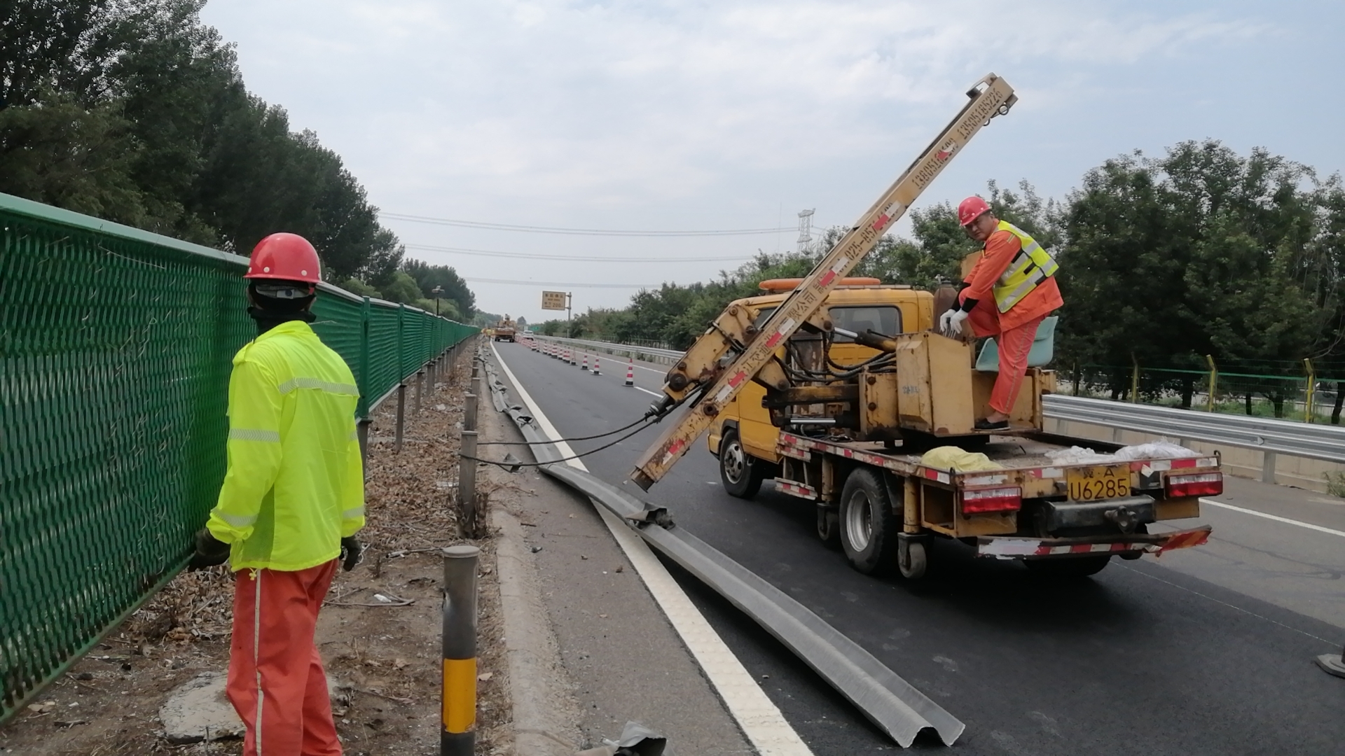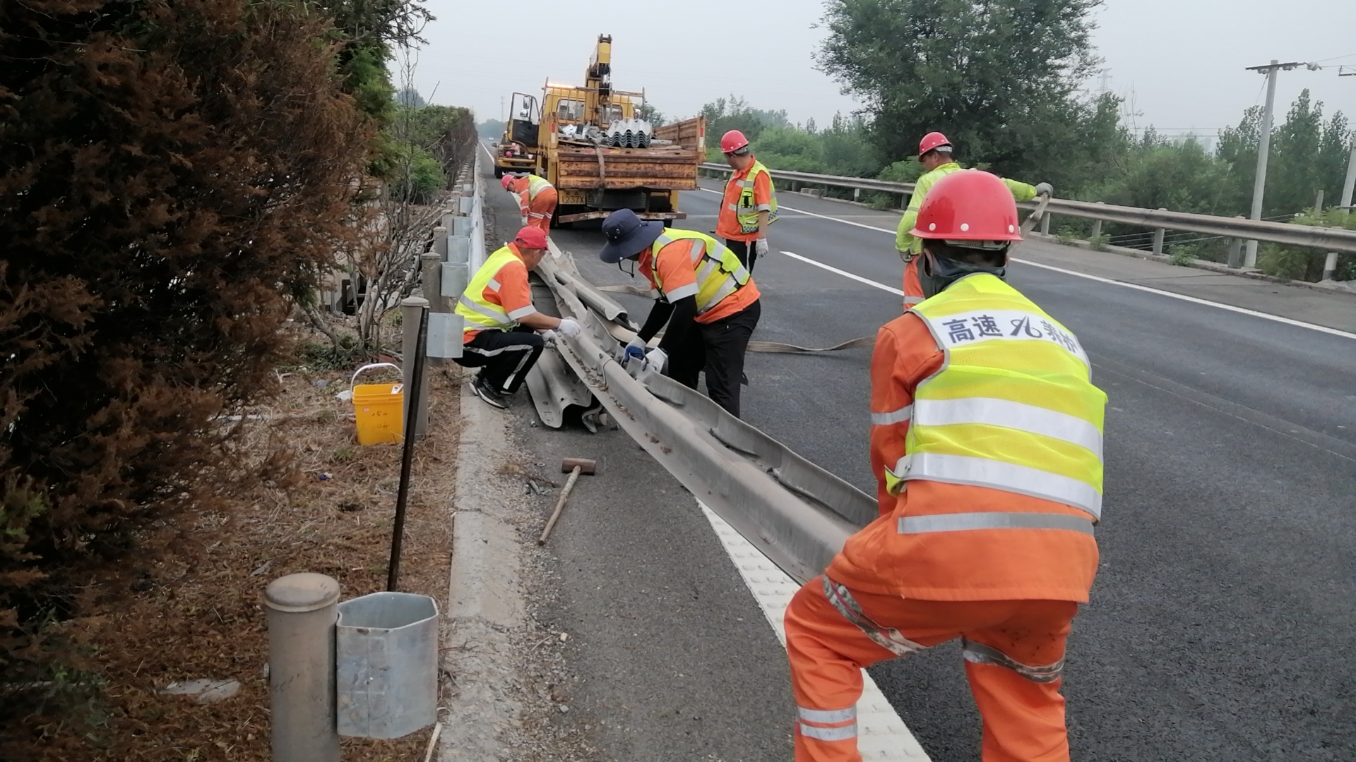 二是石黄高速中央分隔带48块护栏板损坏急需维修。7月17日,养护队全员齐上阵,现场分成若干小组,拆板、调直立柱和割板作业配合默契,为提升工作效率,节省交安设施收、放时间,全体干部职工在施工现场解决了午餐,稍作休息后便立即投入到工作当中,充分发扬藁城养护队吃苦耐劳的优良传统,从上午8时直至下午18时,从拆除第一块旧板到安装完最后一块新板,整整10个小时的辛劳作业,换来了中央分隔带的整齐划一。