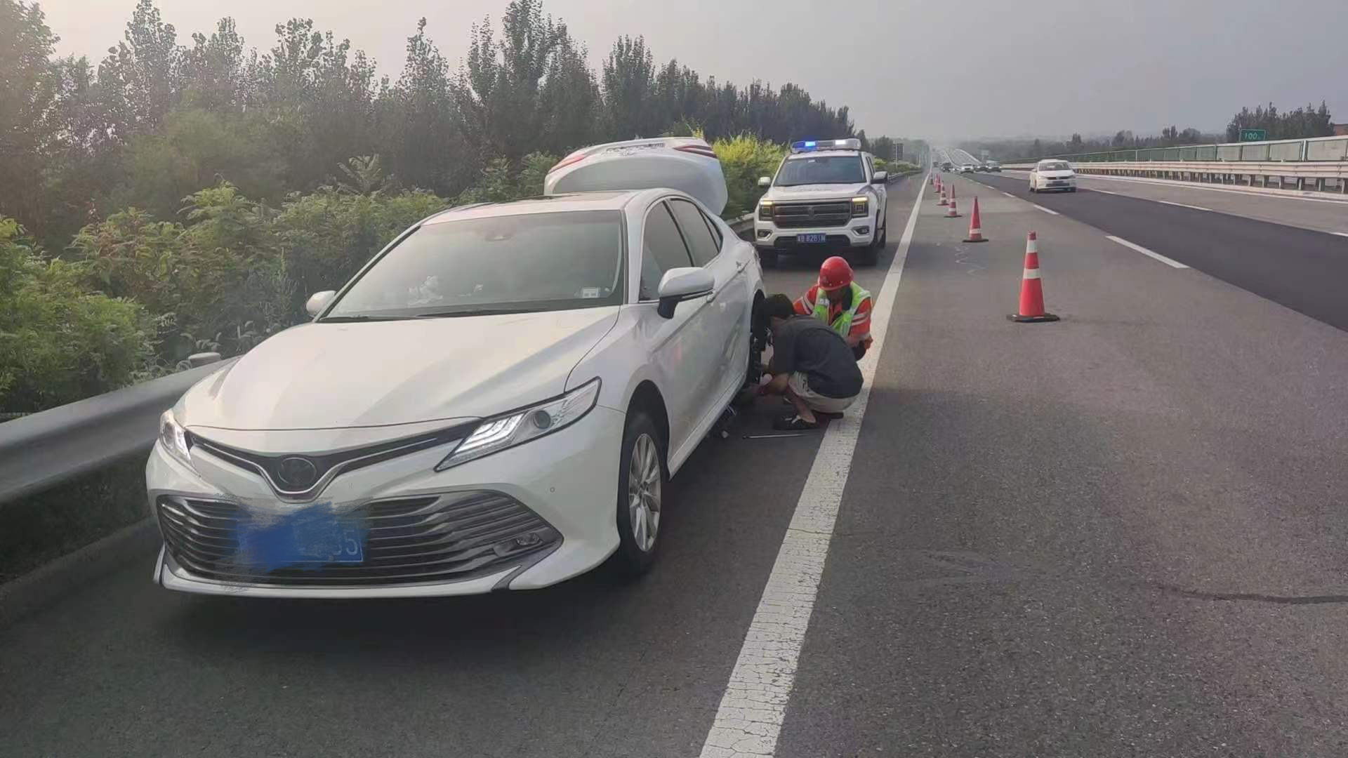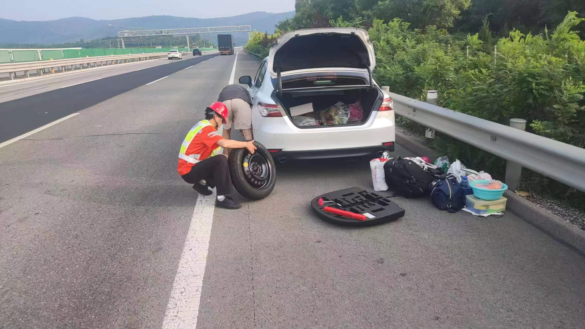 9月16日,正值中秋放假期间,14时,京哈北线分公司指挥调度中心工作人员在执行巡逻任务中发现,北京方向K131附近一辆白色小客车开着双闪停靠在应急车道,司机在车后方查看轮胎。见此情况,大队人员立即将巡逻车辆停在应急车道,并向前询问司机情况。