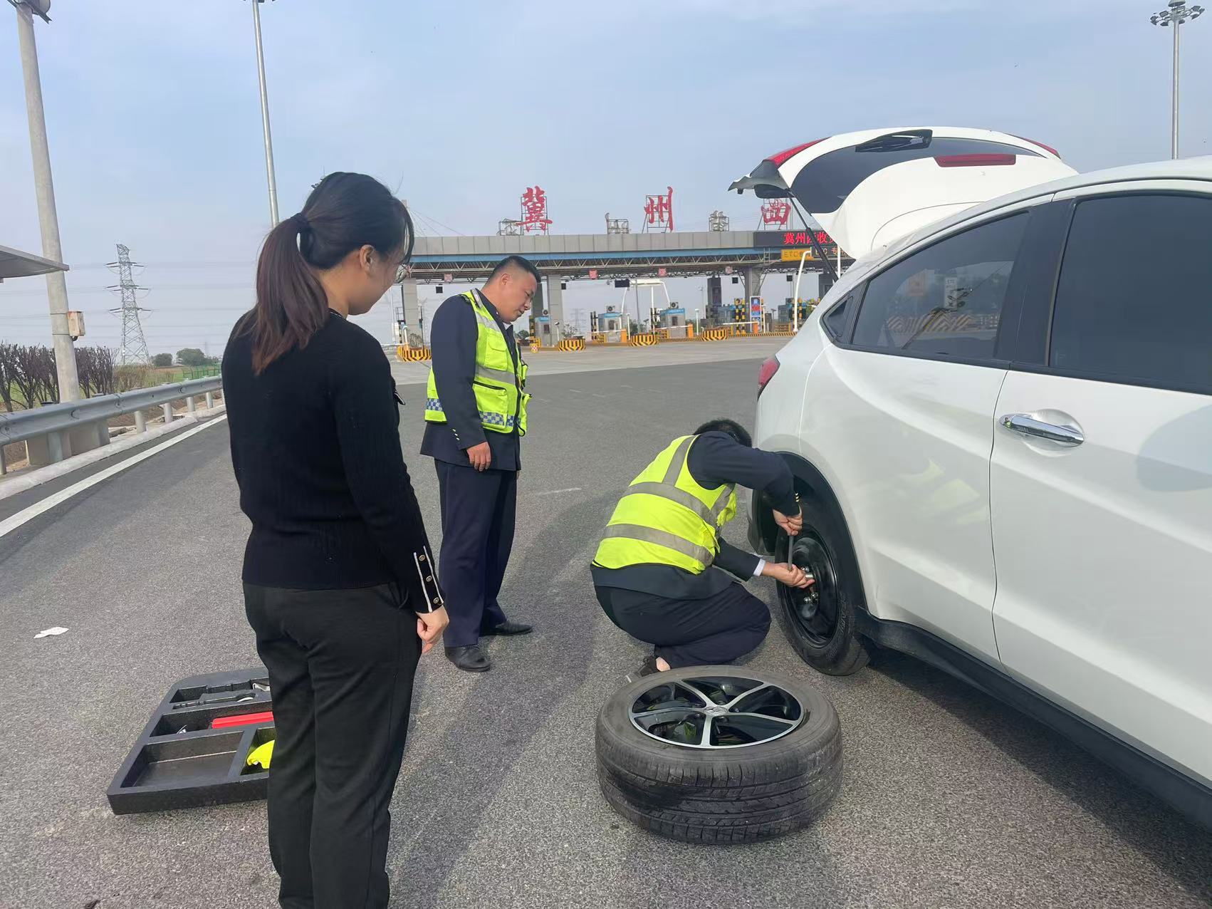 收费班长和疏导员迅速上前查看。他们一边引导其他车辆有序通过,维持通行秩序;一边将司机车辆引导至安全位置,并组织人员为车主更换备用轮胎。工作人员熟练地拿起工具,在确保安全的前提下高效作业。