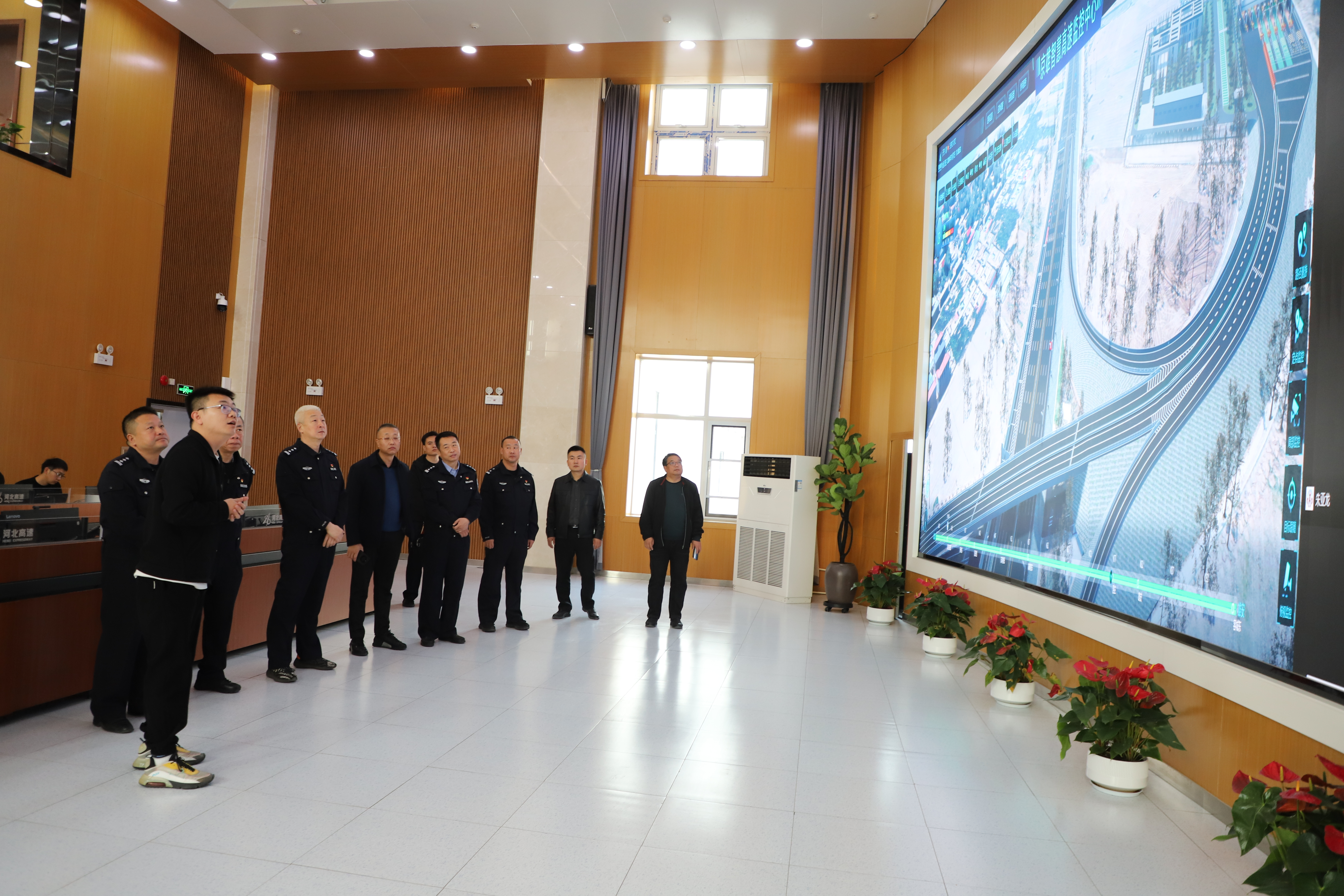 高速交警一行实地走访了京雄高速智慧监控中心,听取了综合管理软件平台建设及使用情况讲解,详细了解京雄高速智能车载一体机OBU在准全天候通行方面功能应用,以及在车、路、云协同一体化方面的管理和落地实效,演示了从云端事件下发到车端事件提醒、再到中心状态监管流程。针对京雄高速现有的能见度检测仪、全要素气象站以及路面状态检测仪等设备数据的准确性,位置分布和数据指标等方面进行了深入探讨。