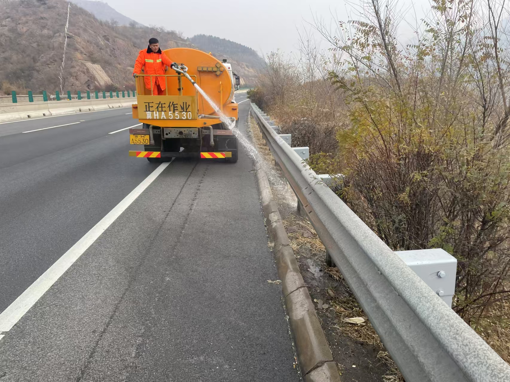 随着冬季的临近,为了确保高速公路绿化带植物能够安全过冬,11月8日,安匠养护队开展了浇灌“封冻水”的养护工作,为绿化带植物披上了一层坚实的“保暖衣”。