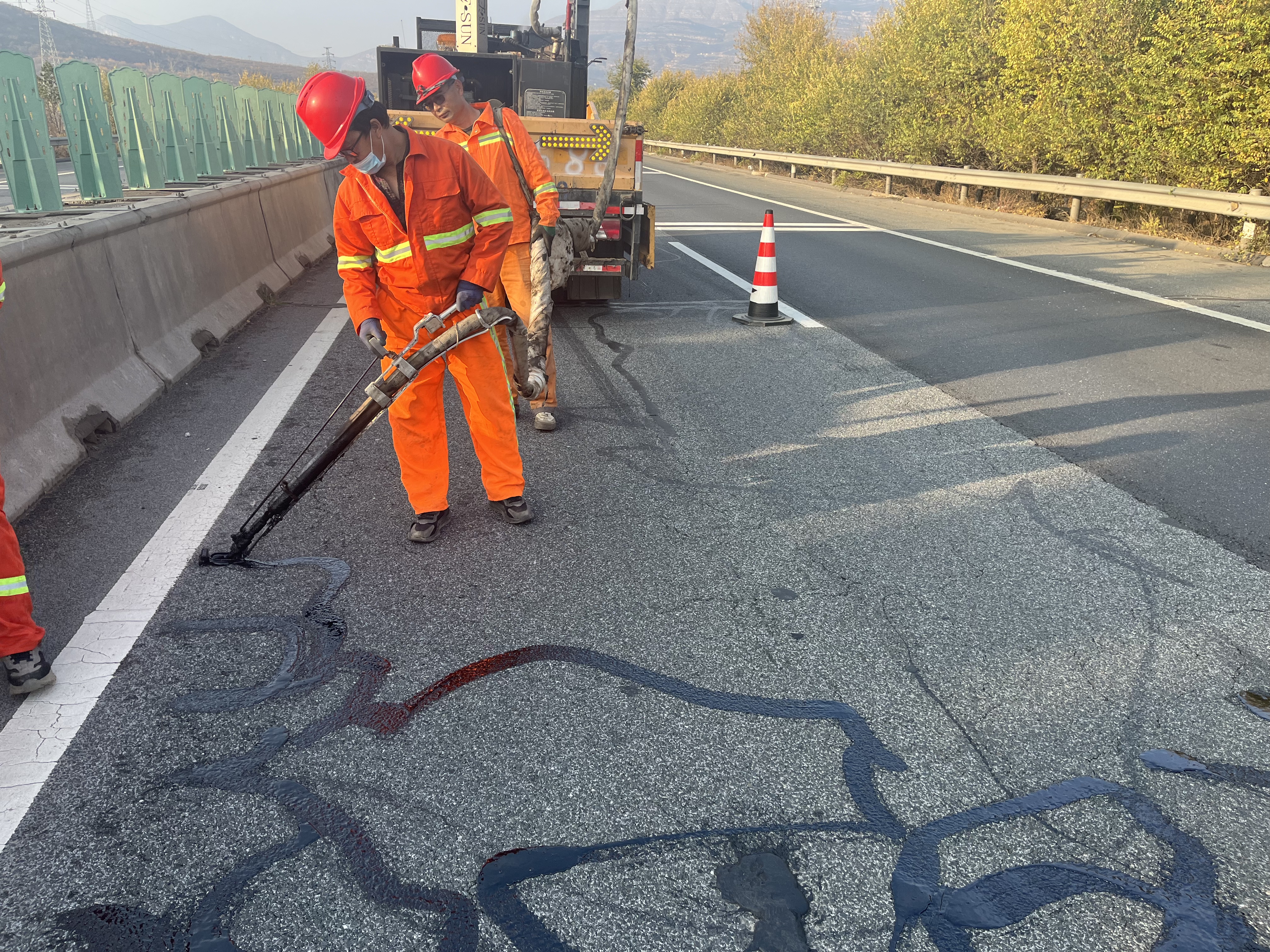 随着秋冬季节的来临,气温逐渐降低,高速公路路面也迎来了新的挑战。为保障高速公路的良好状态和行车安全,涞水北养护队的路面灌缝工作正如火如荼地开展。