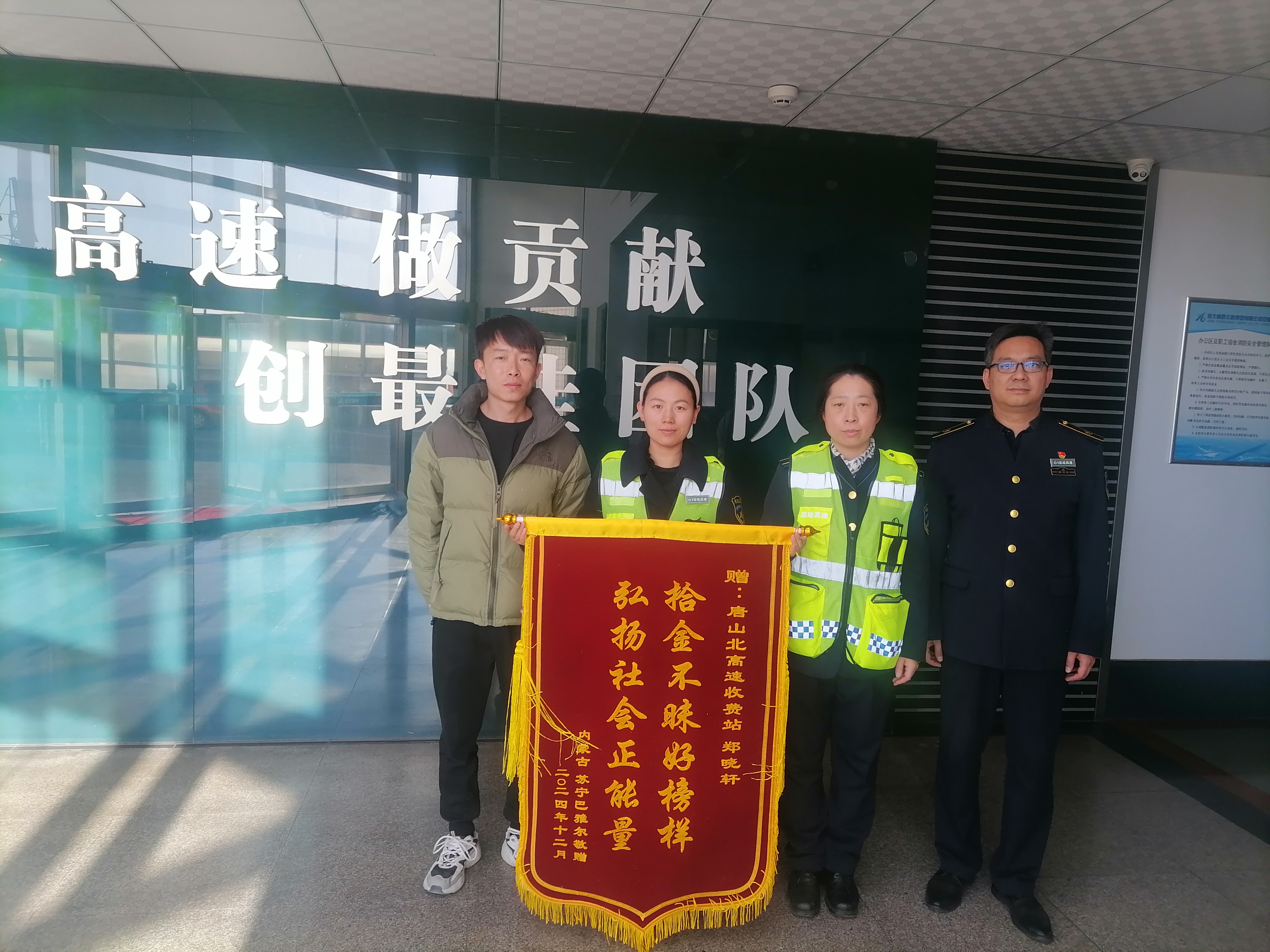 12月17日下午,唐山北收费站收到了一份意义非凡的馈赠——一面印有“拾金不昧好榜样,弘扬社会正能量”锦旗,车主苏宁巴雅尔以此向工作人员拾金不昧的行为表达了深深的感谢和赞美。