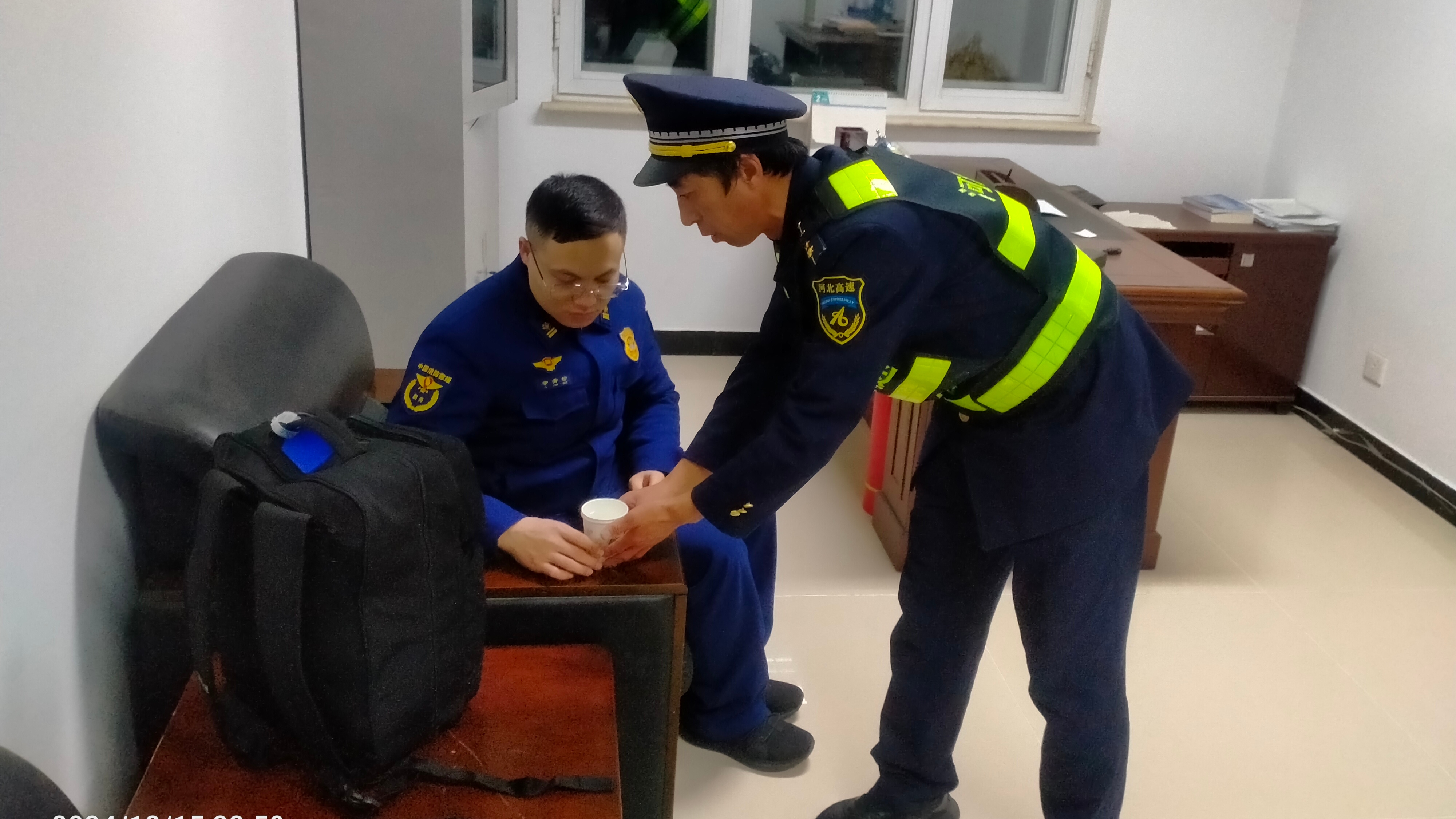 12月15日晚 11 点多,围场县城气温已降至零下16度,风如刀割般刮过脸颊。围场北收费站收费员李海龙在日常的巡视中发现了一位身着消防制服的年轻人独自站在下道口路边等车。经询问得知,他是驻防围场县塞罕坝的森林草原消防员,来自石家庄,因家中突遇急事,正在这里等待家人赶来接他。