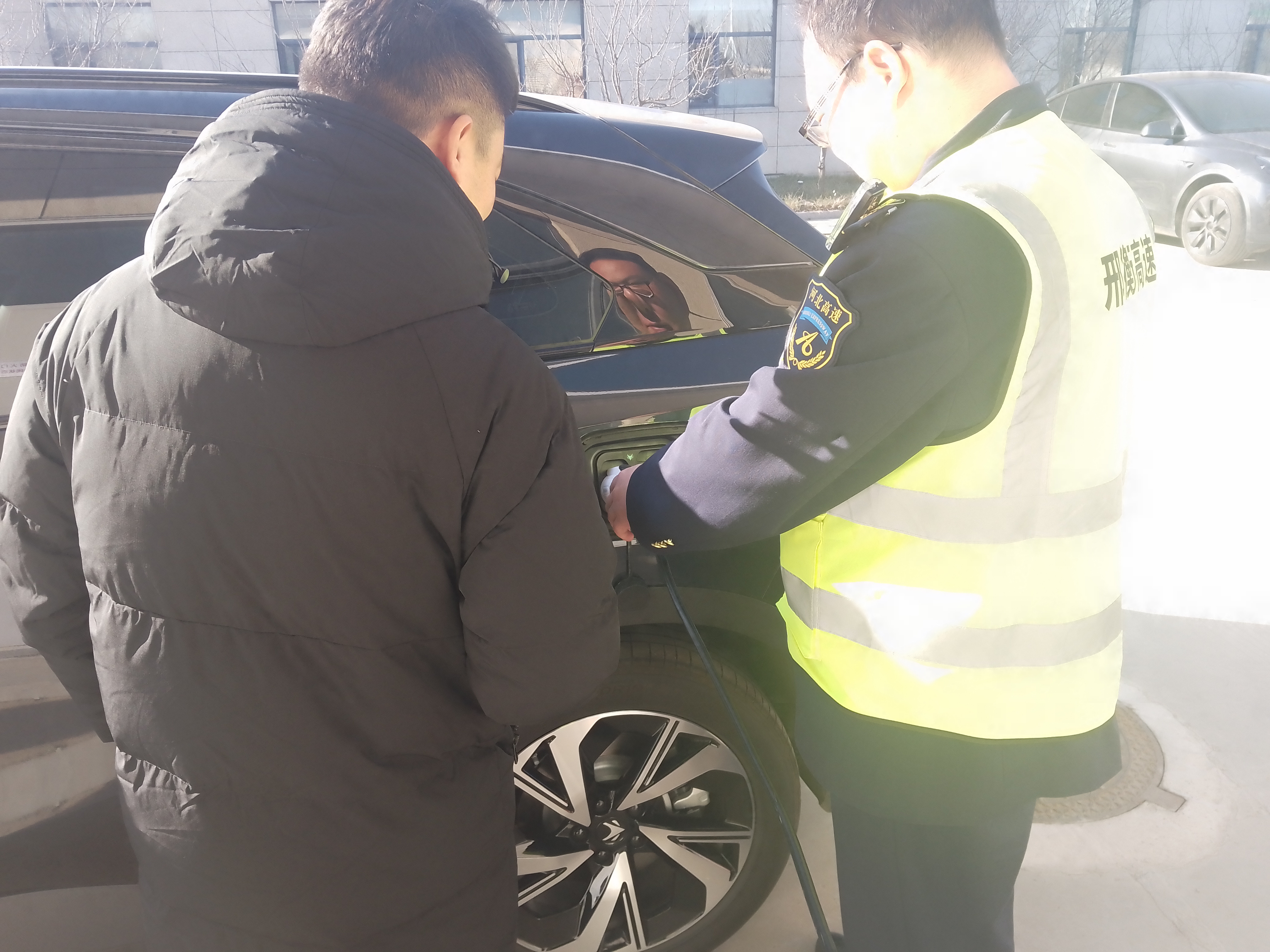12月22日,一辆小型新能源汽车停在了冀州西收费站收费广场,当班班长第一时间上前询问,经了解,司机从天津到冀州探亲,在沿途服务区没有充电,计算着车辆续航里程,应该能到目的地,可是下高速时汽车电量严重不足,距离目的地还有15公里,现在寸步难行。