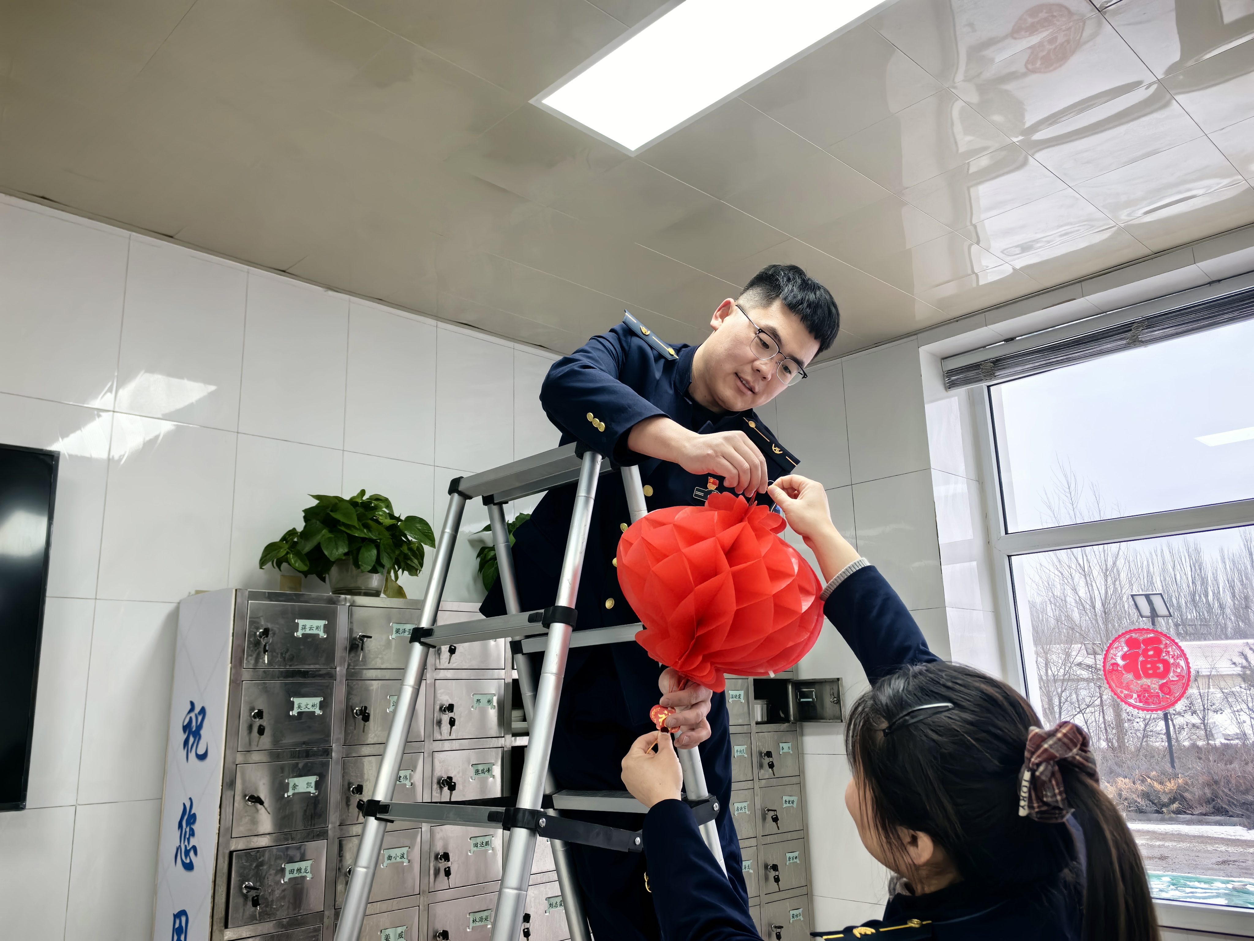 各单位也通过贴对联、贴窗花、挂灯笼、写福字、插红旗等多种形式迎接新年的到来,处处洋溢着喜乐的新春氛围。