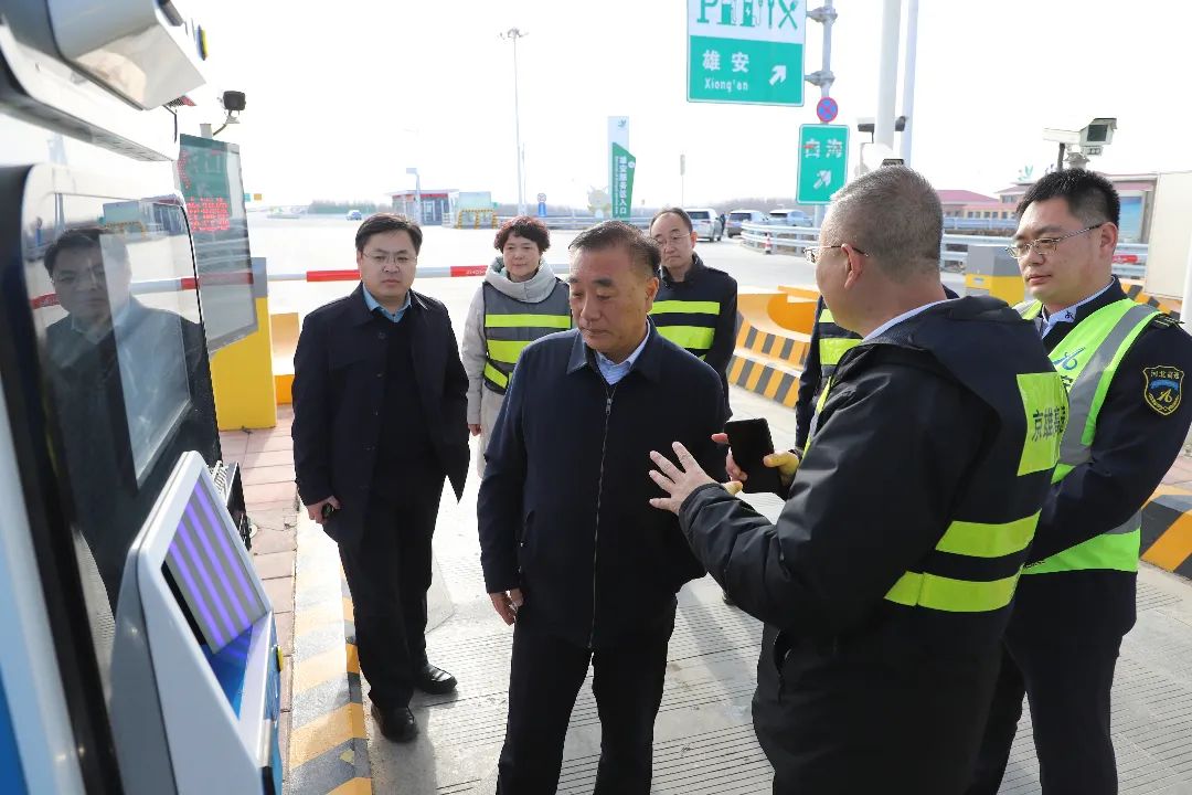 杨荣博一行到雄安北收费站听取收费机器人运行、无人值守站规划建设情况介绍,察看办公场所、职工宿舍升级改造等情况;实地走访监控中心,听取智慧化平台建设、直播间打造、高速预警系统功能介绍;了解机关职工活动室等建设情况。
