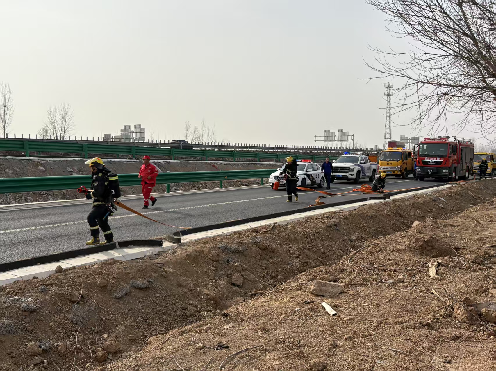 为全面提升应对处置各类突发事故能力,筑牢道路安全防线,3月13日下午,京沪分公司沧州保通保畅应急大队与高速交警青县大队联合协作,开展事故处置及施工现场安全防护预案演练。