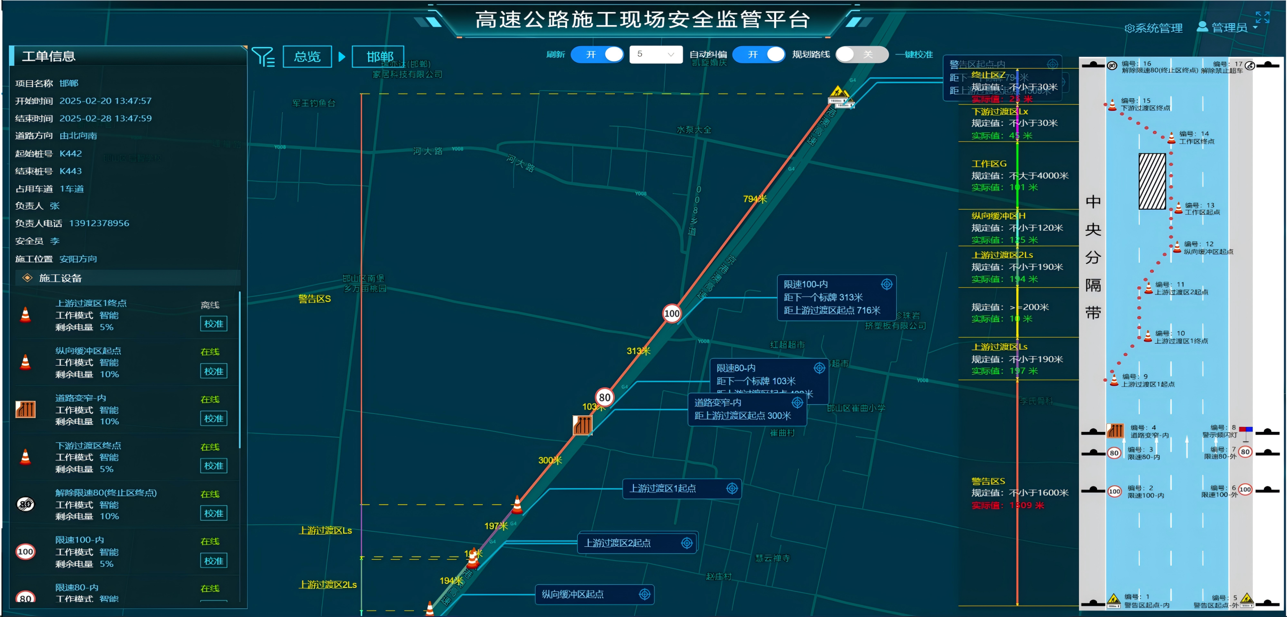 监管系统通过搭载太阳能供电系统的北斗卫星定位系统,实时采集、精准标定、远程监管高速公路养护施工控制区的位置与距离, 并持续预警施工信息。通过电脑PC端与手机APP远程监管平台,结合现有全程监控,各级管理人员可实时查看施工区域动态,实现全程数据追溯功能,成功构建起“前端感知-智能研判-即时响应”的安全防线。在石安分公司养护工程实践中,该平台展现出显著成效,石安分公司主线养护工程施工现场,标志牌、路锥整齐排列摆放精准、规范。