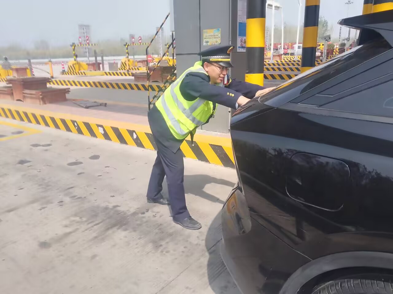 4月7日,一辆黑色轿车在即将驶出收费车道时突发故障,无法正常行驶。收费人员立即上报班长前来处理。