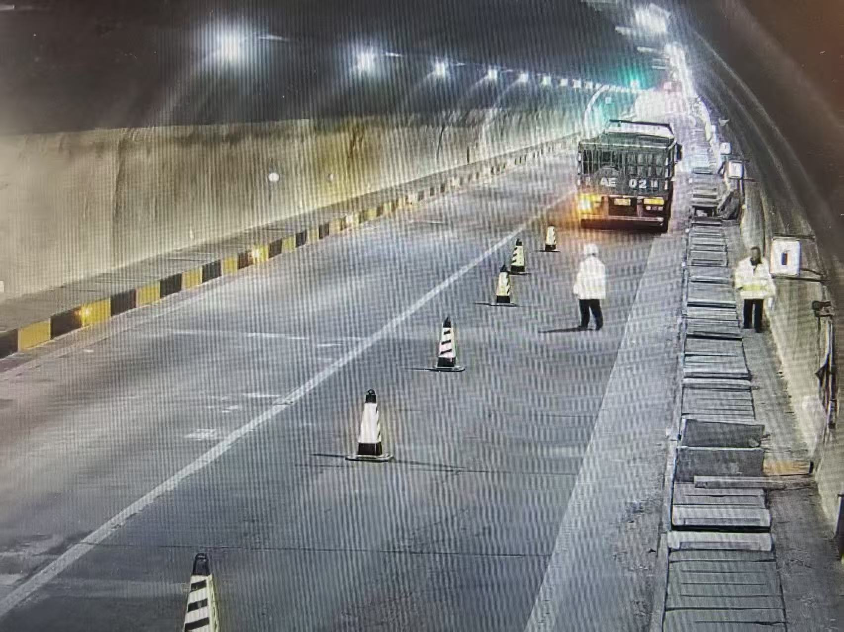 现场可见驾驶员开启双闪警示灯后下车检修,保通保畅应急大队快速响应,在故障车辆后方规范设置反光锥实施安全防护。经多方协同处置,故障货车于12时55分由专业拖车安全拖离隧道。14时15分,养护人员彻底清除路面残留油污,回收全部安全警示设施,隧道全面恢复正常通行。