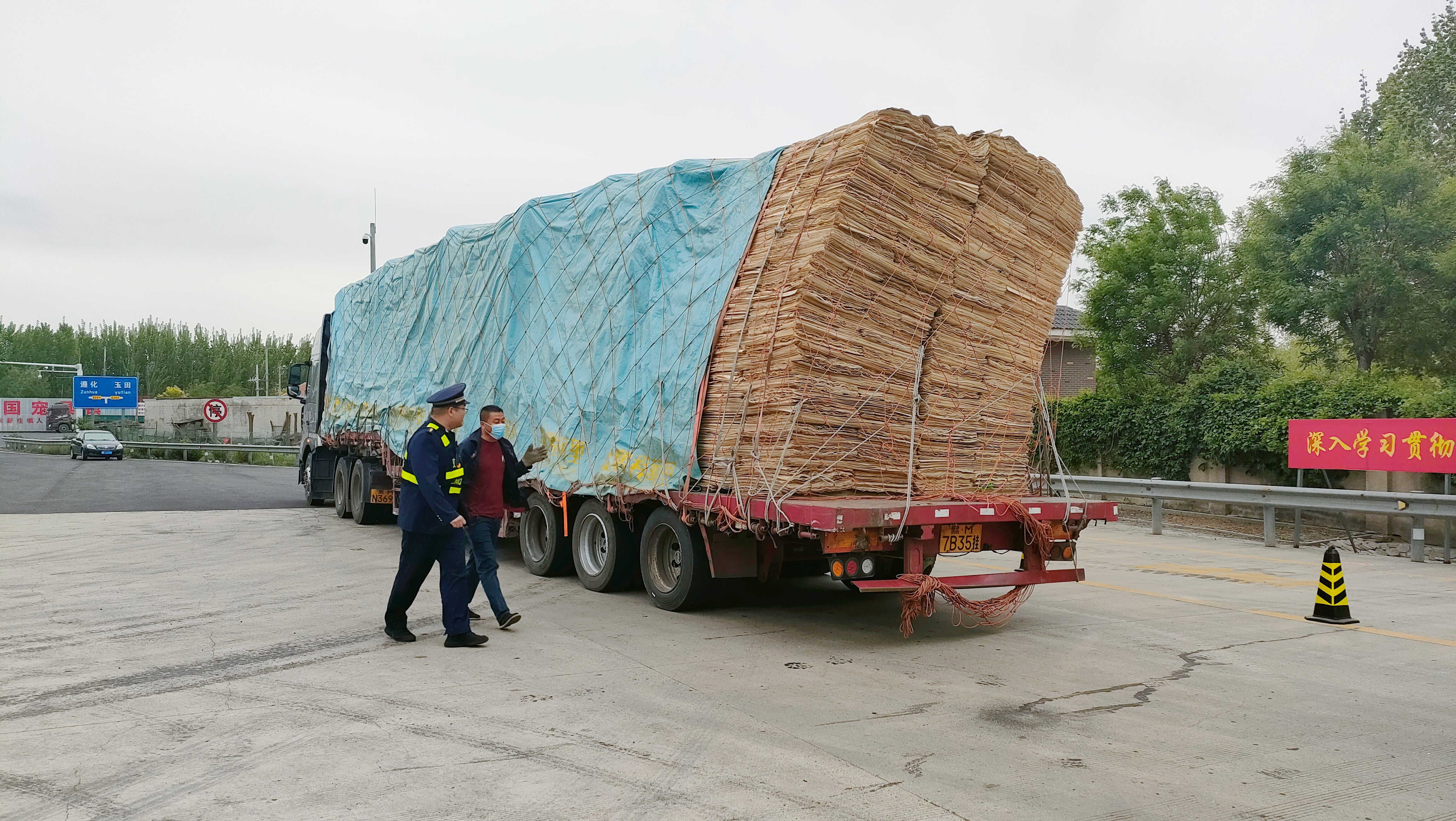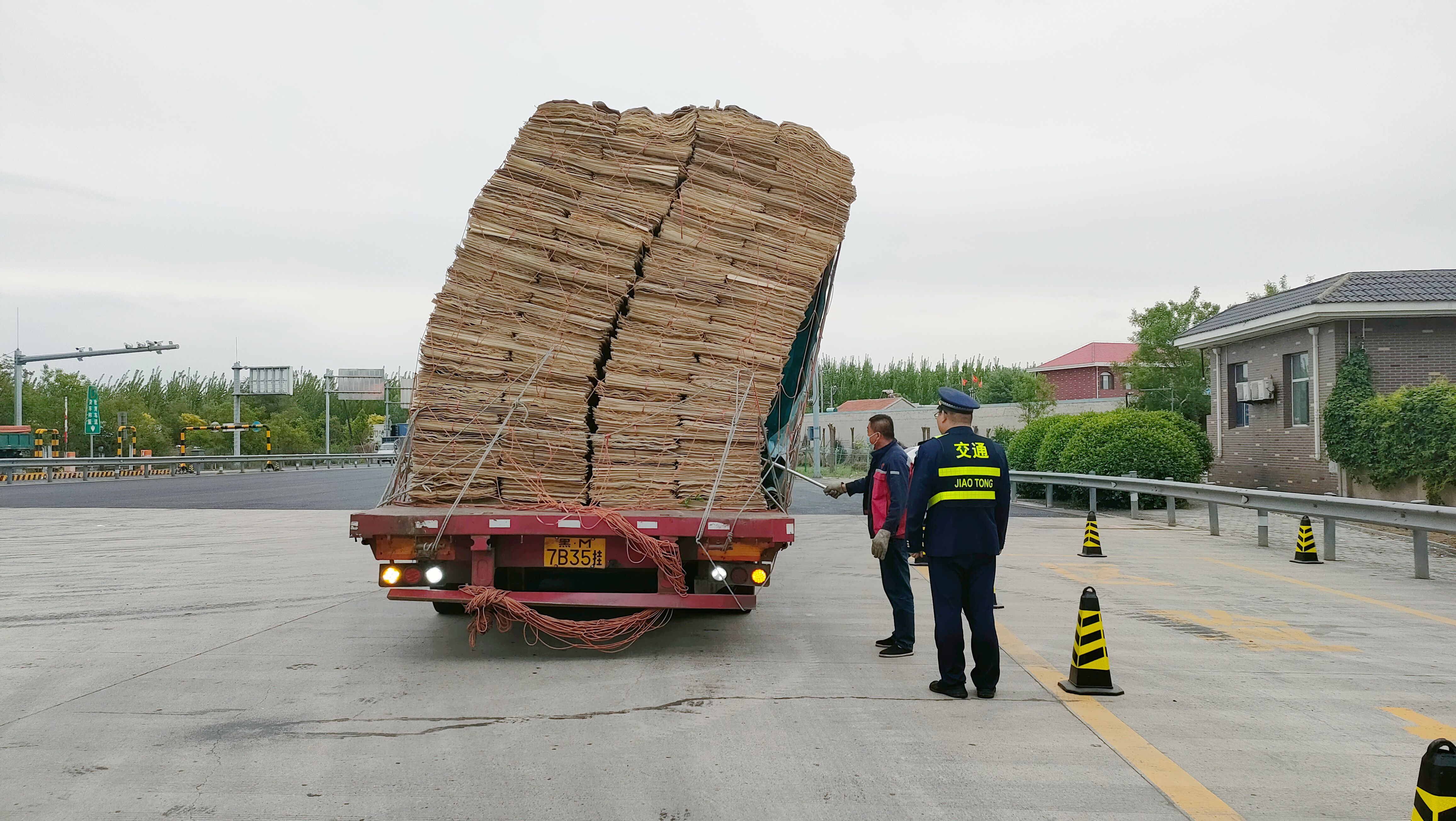 5月1日上午8时许,一辆满载着木材原料的大货车行驶到东新庄收费站收费广场,就在车辆停车准备缴费的瞬间,车上货物突然发生倾斜,摇摇欲坠的货物不仅对驾驶员安全构成威胁,更可能因散落引发后方车辆连环事故。面对这一突发状况,正在当班的班长当机立断,迅速指挥货车安全停靠至指定区域,并立即摆放安全锥,确保过往车辆行驶安全。紧接着,当班人员积极为司机提供解决方案,并迅速联络附近救援设备,同时组织站内职工进行帮忙,并对货车进行了再次加固。