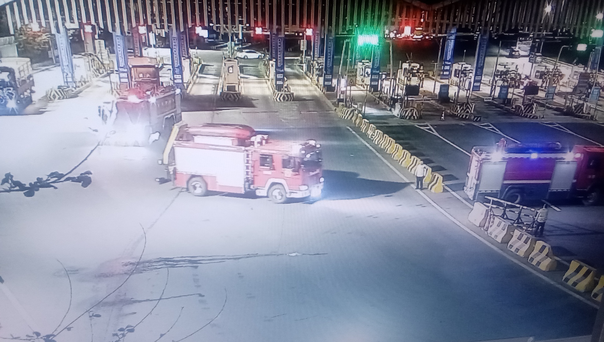 5月2日21时,一辆轮胎起火的货车驶入香河收费站,停在收费广场,司机慌忙下车求助。