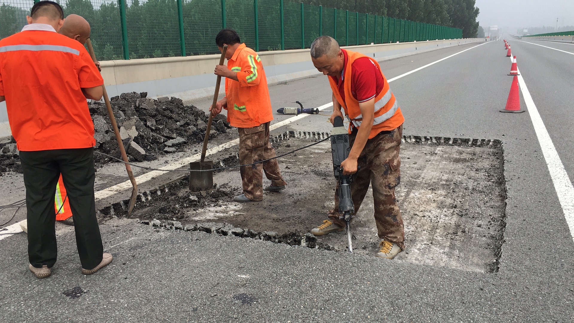 东新庄养护工区组织人员重点对路面病害进行巡查,发现路面坑槽病害随时进行抢修。养护作业现场严格按照作业安全操作规程要求,摆放好施工标志牌、反光锥,并安排专职安全员在后方疏导交通,确保安全防护措施到位。养护作业人员本着“圆坑方补、浅坑深补、小坑大补、连续坑槽合并补”的原则,严格执行养护管理精细化中的修复时限和施工工艺要求,抓紧施工,精心修补,确保每个坑槽均在发现病害后24小时内处置完毕。截止目前抢修处理较大路面坑槽5处,较小路面坑槽6处,累计11处34.4平米,使用冷补料8.6吨。