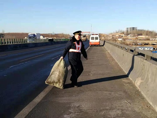 当日8时40分左右,秦皇岛大队外业一中队例行巡查至京哈高速公路北京方向K291附近处时,发现前方车辆突然行驶异常,大量在超车道行驶的车辆紧急制动并强行变道,疑似躲避障碍物。中队长刘闯立即将巡查车辆停好后发现,超车道有一硕大麻袋,目测近百斤,且此处路段正位于石河大桥上,如果有车辆躲避不及,极易酿成重大交通事故。