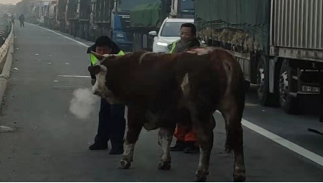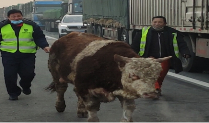 最后一头黄牛受到惊吓后变得十分恐慌,发起了“牛脾气”,“嚒嚒”不停的叫着,在高速公路上乱窜。刘世帅勇敢的与黄牛抗衡,最终黄牛没有斗过刘世帅。救援人员将黄牛吊装到车上,安全驶离高速公路,及时消除了安全隐患。