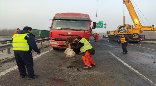 1月27日凌晨2时25分,河北省石黄高速石家庄方向K60+700m处三辆货车发生追尾事故。事故现场三车追尾,最后一辆货车车厢头部损坏,货车上部分黄牛被甩出车外在高速公路上乱闯乱窜,完全不受控制,情况紧急,非常危险。河北高速路政总队石黄支队黄骅港大队外业执法人员李寿强、宋文康接到报案后立即出动,赶赴事故现场。