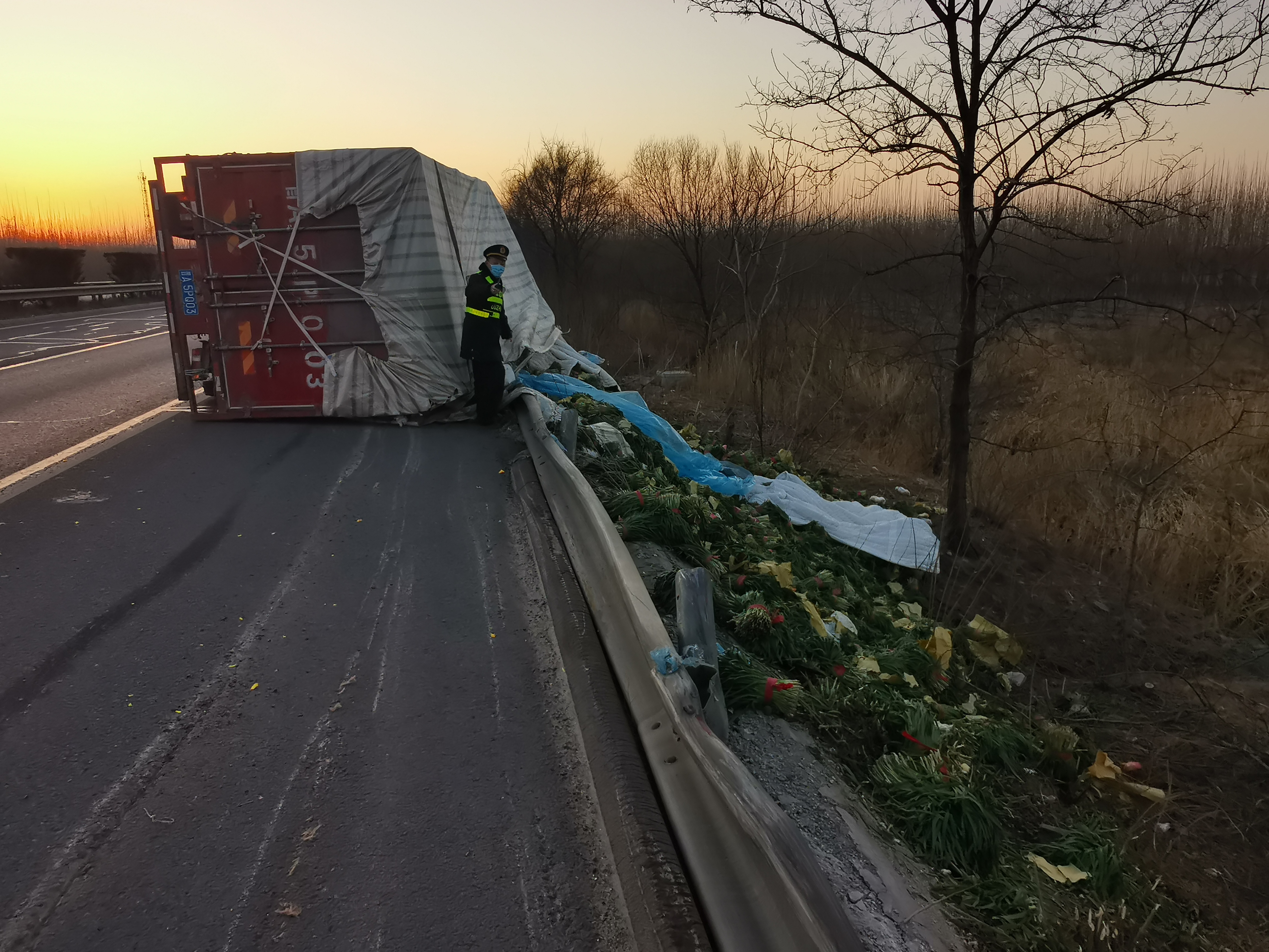 2月3日6时40分,乐亭大队接报警得知,沿海高速天津方向k103+100处发生交通事故,外业执法人员魏国彬、王红江在6时52分到达现场后发现,一辆中型货车侧翻在路肩上,车上装载的韭菜、萝卜等蔬菜散落在边坡上,索性车上人员都没有受伤。执法人员迅速摆放安全警示标志疏导指挥车辆,防止发生次生事故同时为了最大限度的降低当事人的损失,通知了救援公司让其增加施救人员,将车辆装载物进行人工倒货。7时10分救援公司到达现场后,执法人员积极协助救援人员和当事人对货物进行搬运和清点。8时56分货物清理完毕,道路恢复了正常通行。