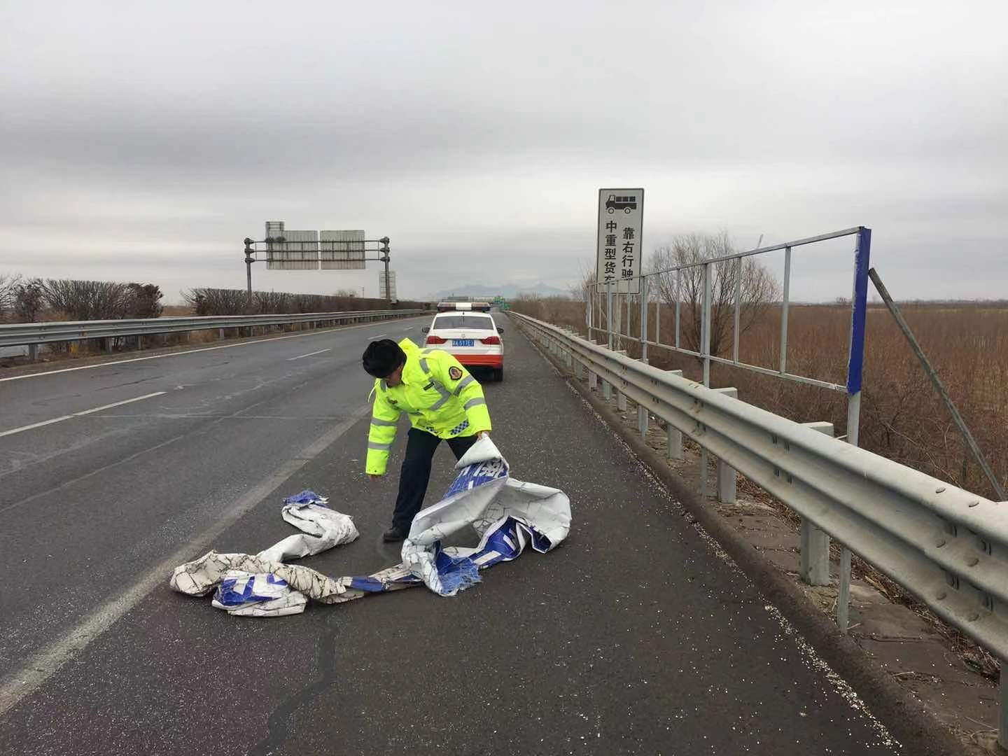 2月14日,大年初三。当天上午,乐亭大队执法人员赵虎、王红江巡查至沿海高速天津方向k58+470处时,发现右侧车道内掉落着一大片车辆苫布,由于正值春节假期,路上行驶的车辆较多,一有不慎极可能发生交通事故。执法人员见状立即停车,一边示意路过此处的车辆减速慢行,注意避让;一边迅速将障碍物拖拽到应急车道内,然后将障碍物装入车上,将其处理掉。