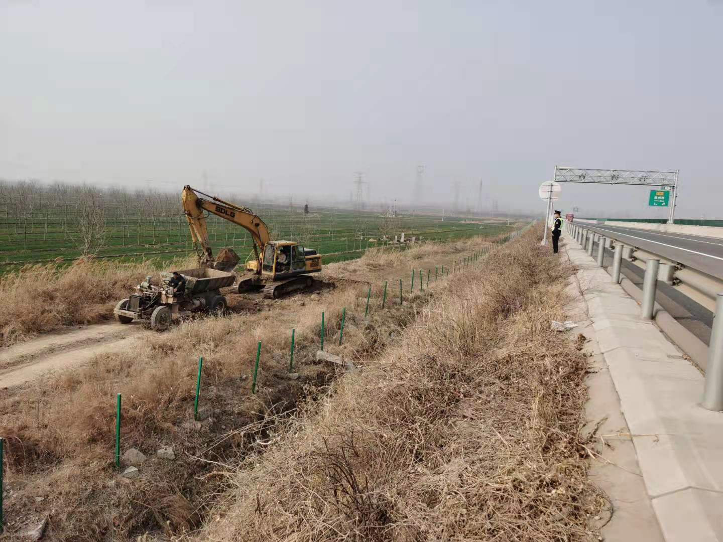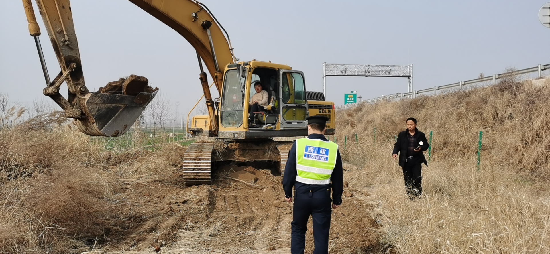 3月9日下午,冀州大队外业一中队路政人员巡查至邢衡高速邢台方向k130+300m时,突然发现路边停有一辆挖掘机和一辆拖拉机正在挖土,经询问得知,当地村民见这里土地属于一片荒地,所以挖土用来垫自己家门前的路,已经挖了2车土了,路政人员立即让其停止了违法行为,随后将该事件的当事人尚某联系到了现场。要求其立即停止挖土行为,并对其进行公路法律法规的宣传,在路政人员的教育下,当事人主动配合,将所挖掘出的沙土进行回填,对已造成的地表损害进行了恢复。本次事件得到了圆满的解决。