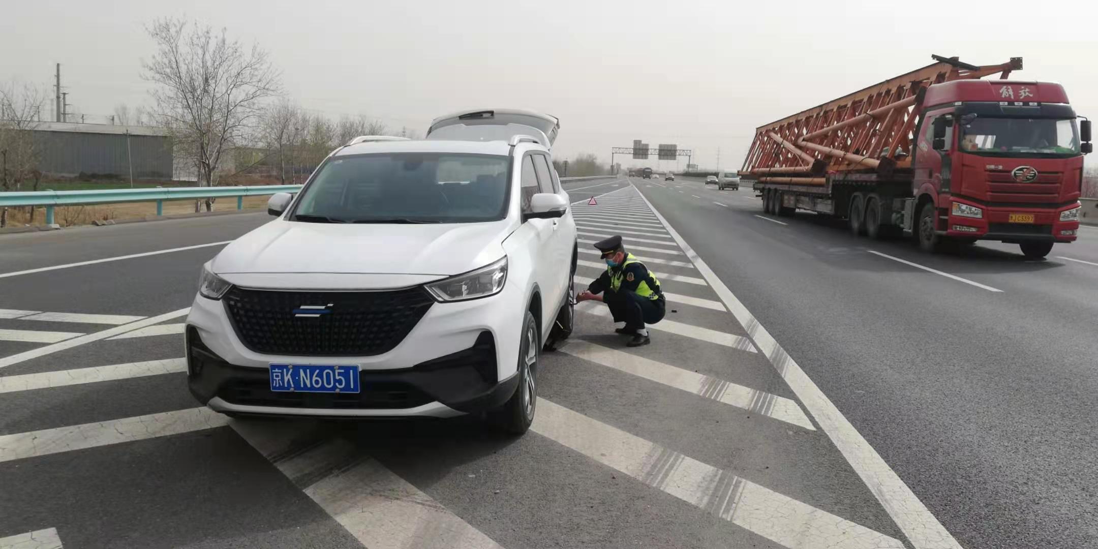 3月16日下午15时许,邢台大队外业三中队巡逻至北京方向K400+500处,发现一故障车辆正在换胎。邢台大队外业执法人员杨昭、张永马上停车,两人分工合作。张永在故障车辆后方摆放安全标志,并进行预警;杨昭拿上巡逻车上的工具帮助故障车司机进行换胎。没过多一会轮胎就换好了,司机十分感谢,杨昭、张永却说这都是应该做的,并嘱咐司机路上注意安全,目送其离开后继续进行日常巡逻工作。