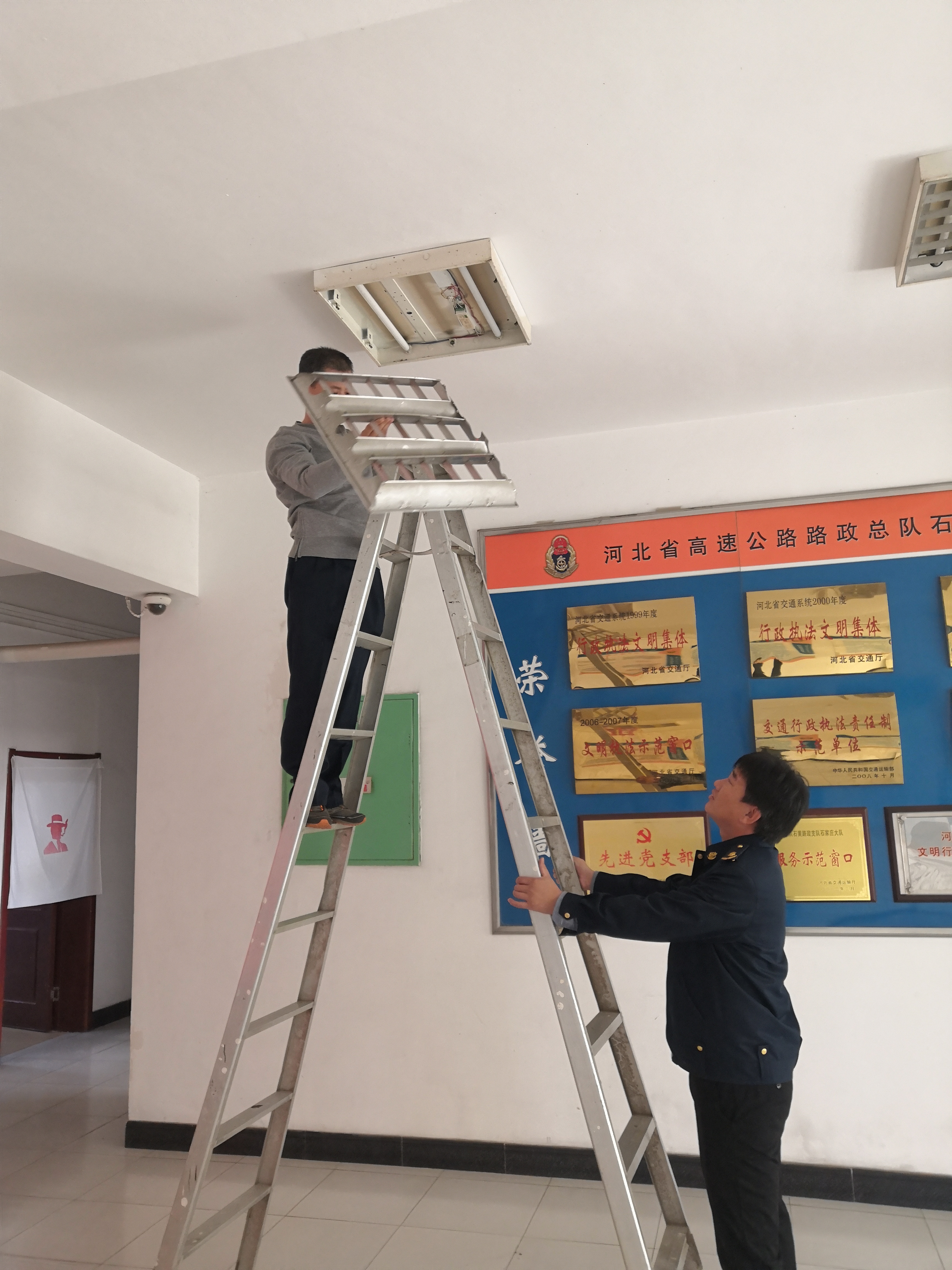3月25日,石黄支队石家庄大队赵军义和李建飞正在维修灯具。