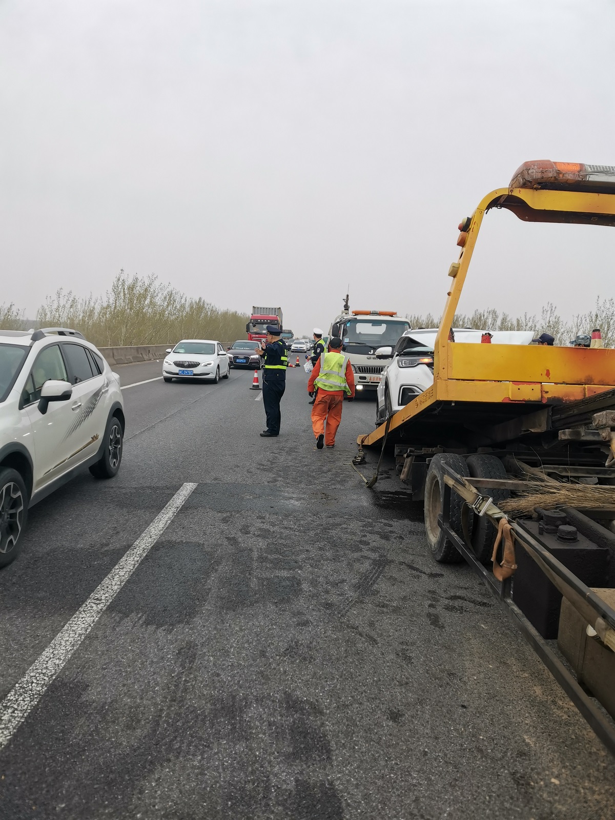 当天下午3时45分,乐亭大队执法人员巡查至沿海高速天津方向k64+420处时,发现有四辆小轿车发生了追尾事故,大量的车辆碎片散落一地,车辆无法正常行驶,所幸未发生人员伤亡情况。由于当时正处在假期返程高峰期,车流量很大,一有不慎极可能发生次生事故。执法人员见状,一边疏导指挥车辆,一边通知了救援公司和高速交警。在3时49分,救援人员和高速交警相继到达事故现场后,执法人员积极配合救援人员对事故车辆进行拖曳和牵引,在路政、交警和救援人员的密切配合下,该事故仅用时9分钟于3时54分清理完毕,道路恢复了正常通行。