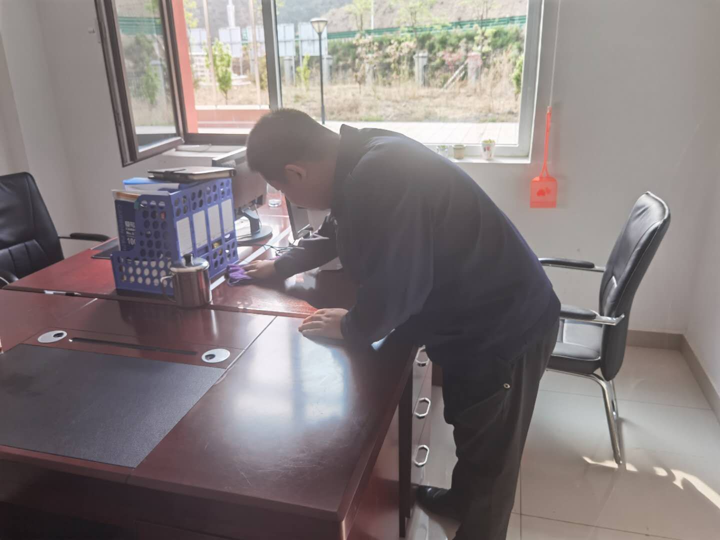 大队值班领导带领大家开始大扫除,为了提高工作效率,办公室提前将打扫区域进行了详细划分,每个人按各自责任区有序、有效的开始打扫。活动中大家以打造干净、整洁、有序的办公环境为目标,从细微处着手,分别通过对地面大清扫、办公用品大整理、办公环境大清理的行动,全面强化办公区域环境管理,提升办公区域环境品质。
