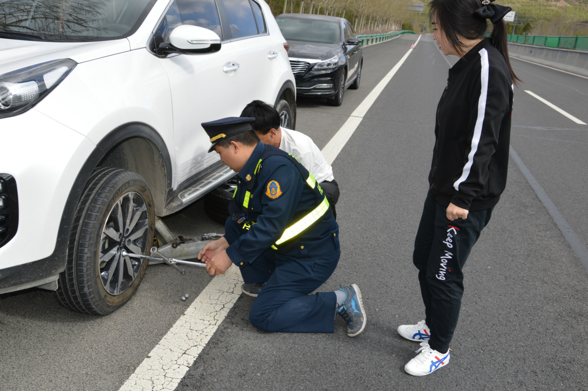 图五:车辆爆胎高速路抛锚,路政人员热心帮助司机更换轮胎温暖回家路,这一跪,是对尊重司乘人员最为生动鲜活的言传身教,最美的姿势,跪出了中国路政的专业.这一跪,救了两条命。