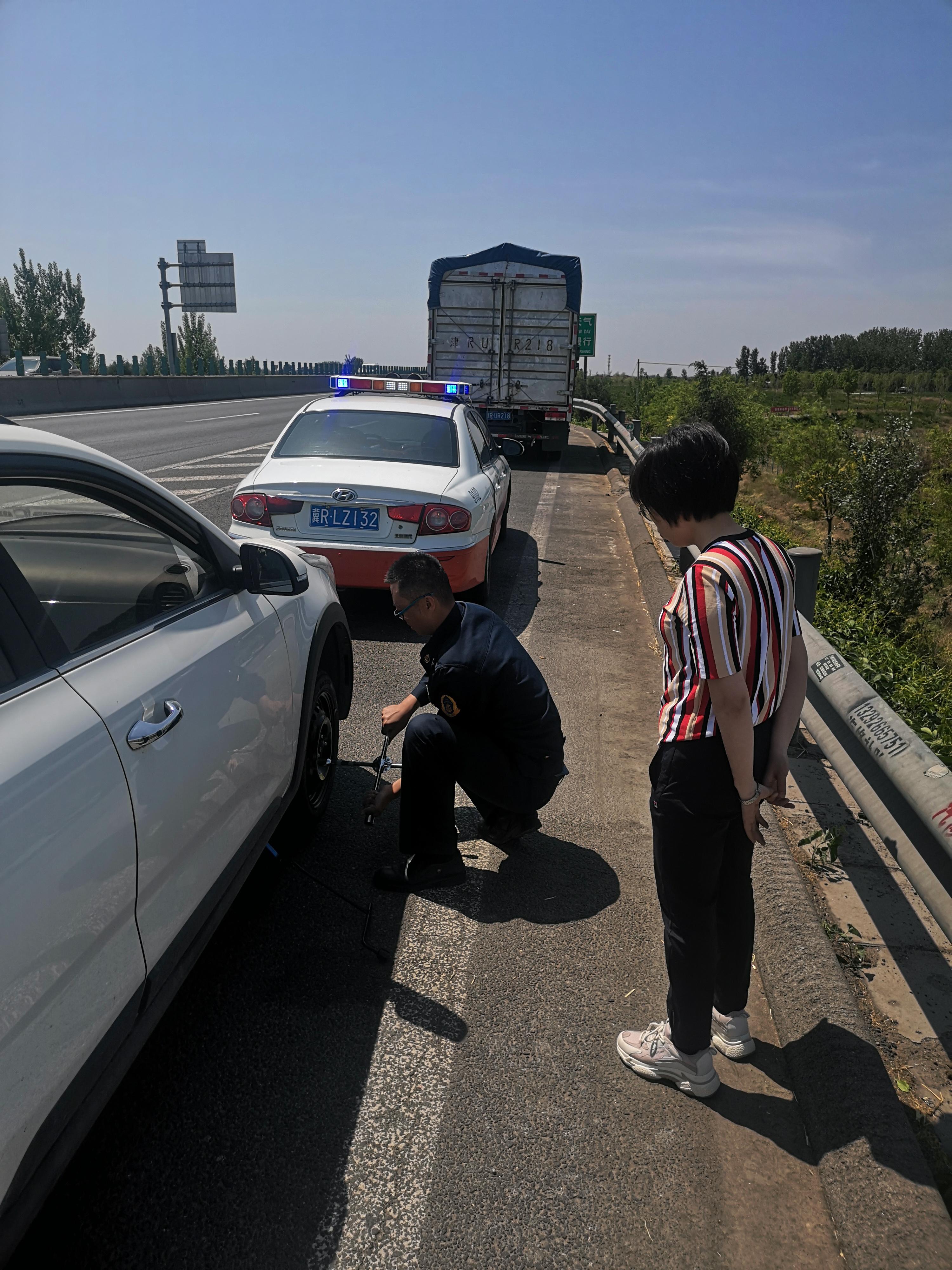 5月6日11时,廊涿支队四中队执法人员武杰、夏军例行巡查至涿州方向239+600处时,发现紧急停车带内有一女士正在不停向过往车辆挥手,支队队员迅速停车查看并询问情况。经询问得知该女士驾车去涿州办事,由于事出紧急上高速前未及时检查车况,行驶到此处时车辆右前胎爆胎,车辆不能正常行驶,且车内未携带修理工具,正在向过往车辆挥手请求帮助。了解情况后中队长武杰随即从执法车辆取下换胎工具,帮助其更换备胎,10余分钟后顺利帮助其更换好备胎。