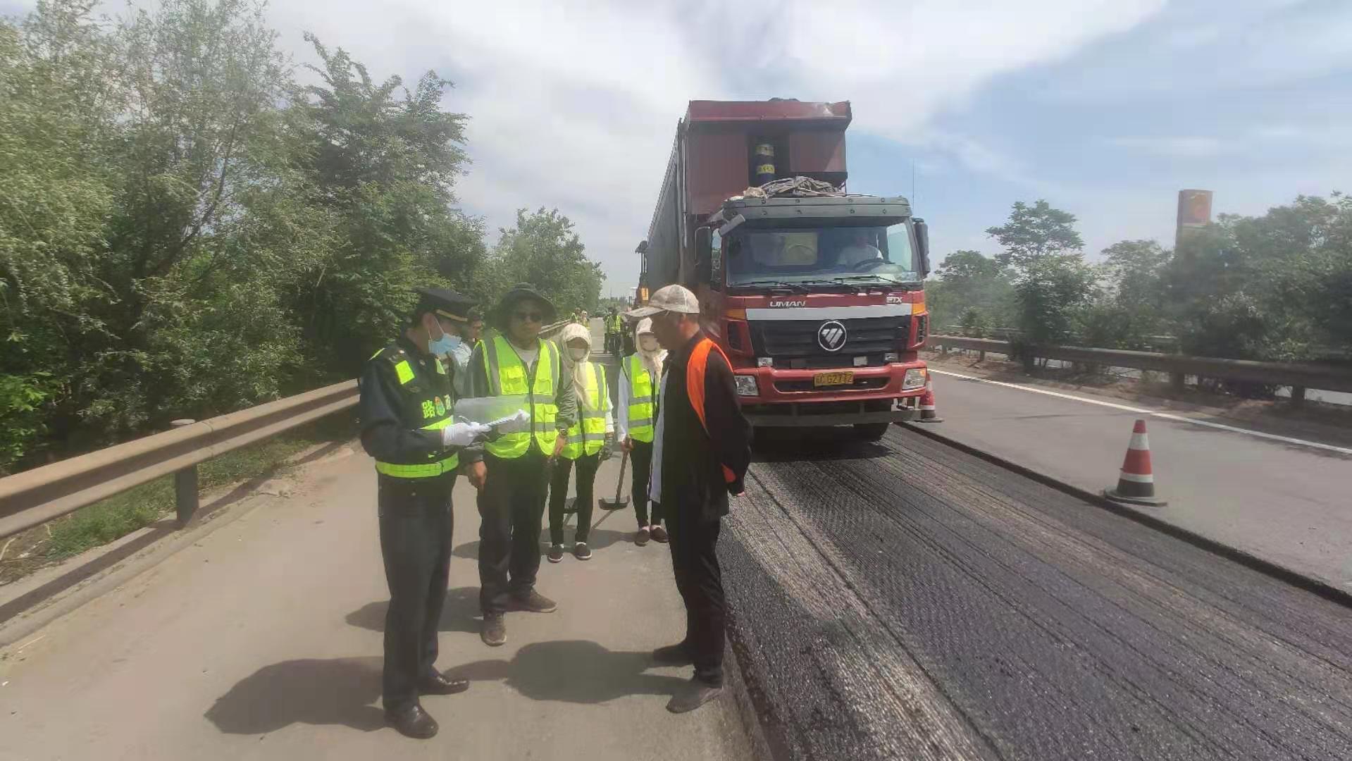 检查人员在郭栋副大队长的带领下对路面病害处理、施工罩面、边坡防护等三类施工项目的五处施工标段进行了检查。检查以安全标志是否齐全、安全员站位是否正确、施工人员是否着装整齐、作业路段是否堵车、作业路段是否符合规定等内容为主,采取了全程录像、指出问题、交换意见和责令整改等流程步骤和方式方法,对发现的施工人员着装不规范、反光锥桶扶正不及时.安全员站位不准确等问题给予了指导和纠正,并让当事人现场进行了整改。