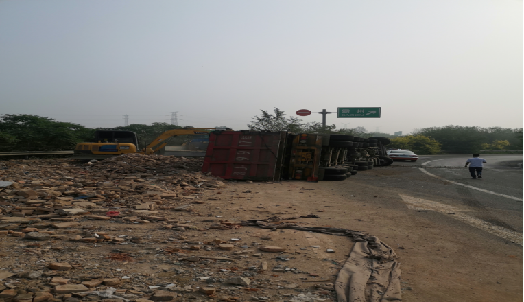 到达现场后一辆货车侧翻在匝道内,大量砖块散落在路面,现场一片狼藉,影响了行车安全的畅通及安全,中队长任齐林安排路政队员做好预警,路政员在后方摆放反光桶并协助高速交警疏导交通,确保车辆有序通过,现场需要吊车作业,铲车,人工等,路政执法人员与高速交警进行沟通,将暂时封闭道路,经过1个小时处理,事故车辆吊离匝道内,散落在路面的货物也进行集中处理,现场积压车辆得以在慢车道缓慢通行。