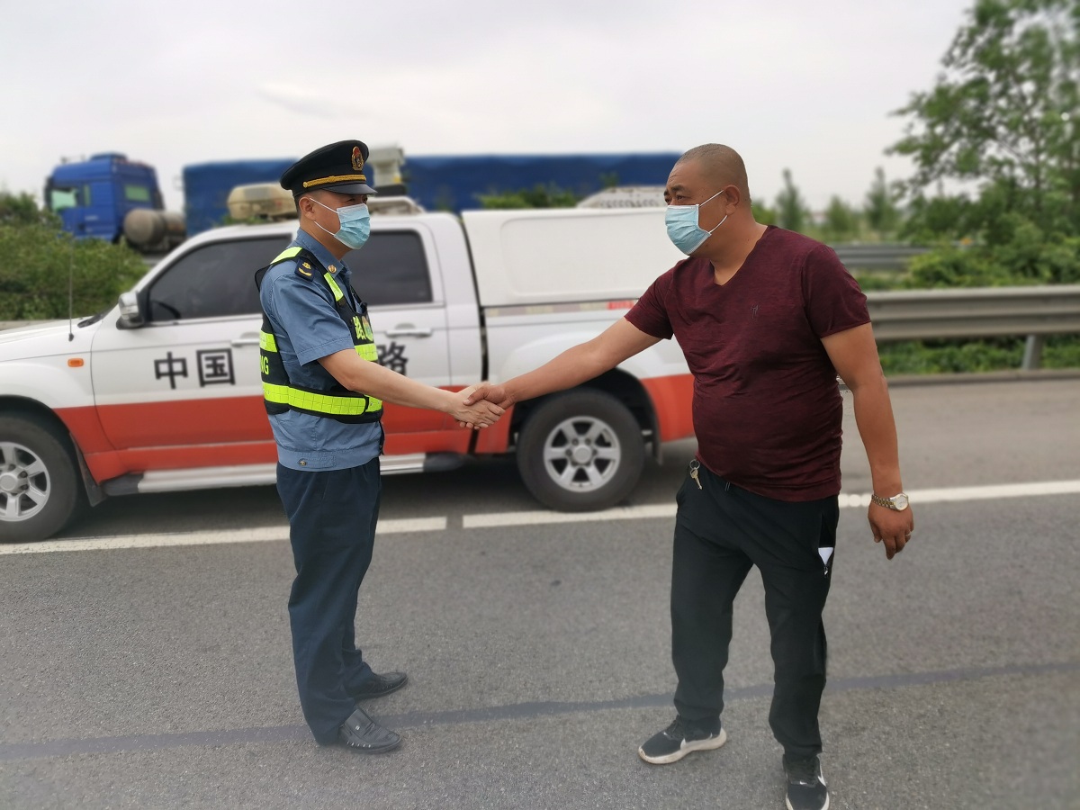 当天15时20分,乐亭大队接到求助电话,当事人讲述自己护送大件车辆的护送车出现了高温故障,不能执行护送任务,其两辆大件车辆停在在了沿海高速秦皇岛方向k97+500处的应急车道内,请求路政部门给予救助。大队负责人得知情况后高度重视,立即作出了积极救助、免费护送、保障安全的处理决定。外业执法人员魏国彬、肖穆鑫、王红江在15时36分到达大件车辆停放位置,在核查该车辆的超限运输车辆通行证合法有效,确认护送车辆确已出现故障不能正常行驶后,采取了大件车辆在前、路政车在后、车速不超过60公里、居中行驶、开启双闪灯的措施,将两辆大件运输车辆护送至昌黎南收费站,停靠在安全地带,等待护送车辆故障排除后继续前行。当事人对执法人员文明的举止、热情的服务和规范的执法再三的表示感谢,并拿出500元钱以表谢意,被执法人员婉言谢绝。