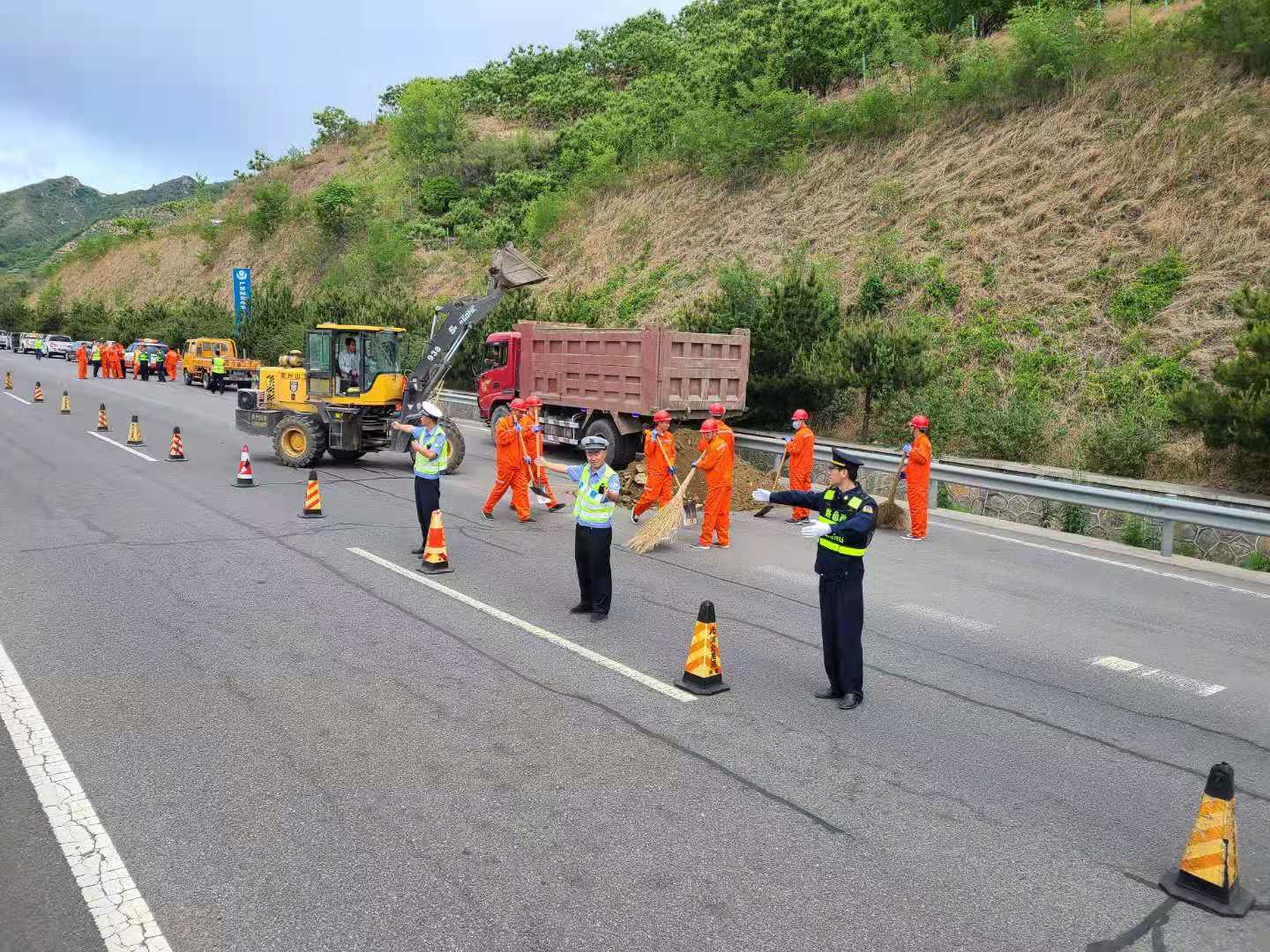 此次演练背景为承秦高速承德方向k100+800处发生山体滑坡,占用应急车道,影响道路通行,无车辆受损,无人员伤亡,迅速启动联合处置应急预案。上午10点演练正式开始,承秦高速八道河工区巡逻发现承秦高速承德方向k100+800处发生山体滑坡。路政、交警部门接到电话报警后第一时间迅速出警到达现场。交警、路政人员到达现场后,及时向监控中心反馈现场情况,立即在事故地点前方摆放安全警示设施,疏导车辆有序从超车道通行。抢险小组组织人员立即对坍塌现场进行快速处理。经过各部门的齐心协力,“险情”在最短的时间内得到了排除。