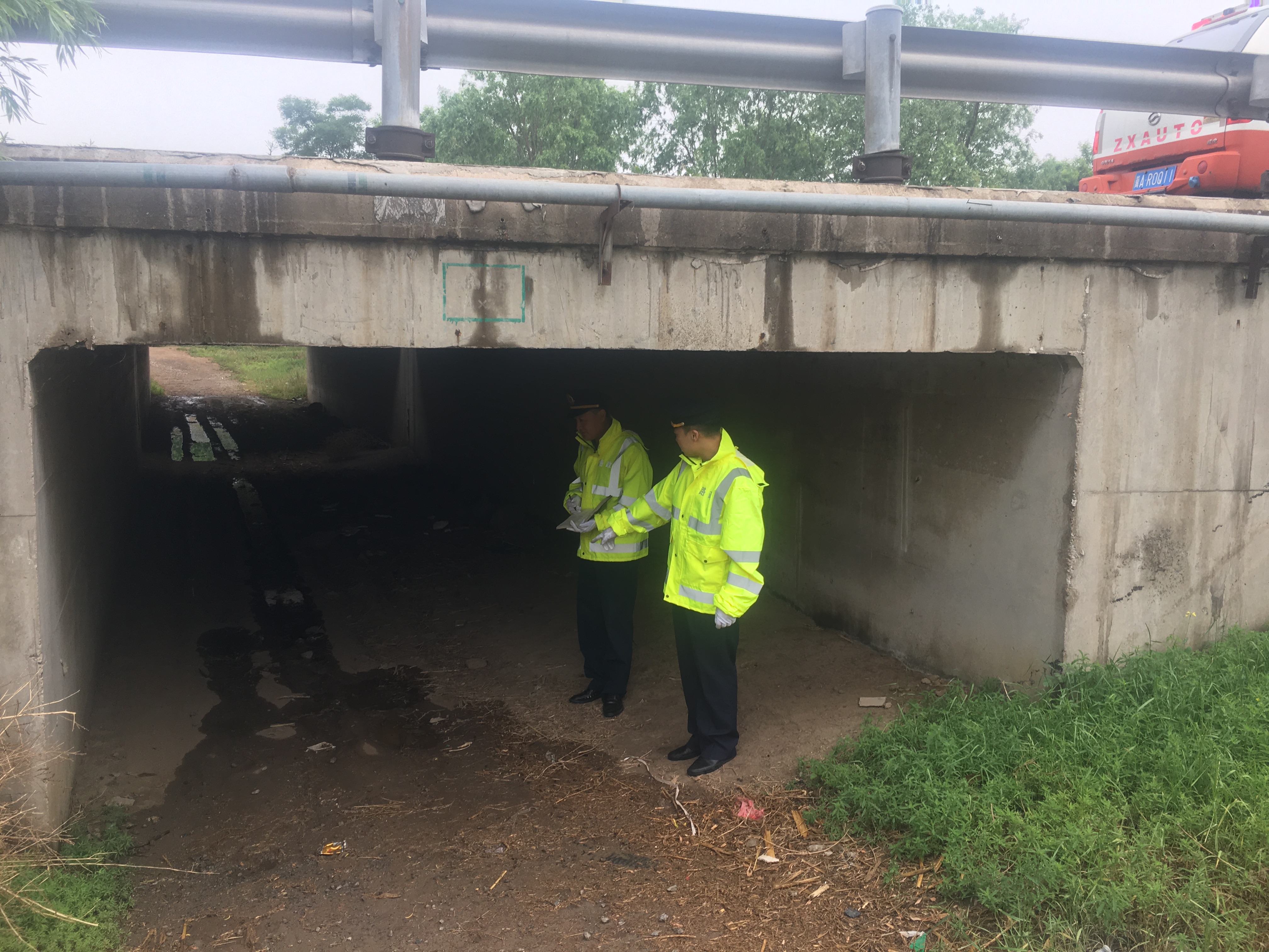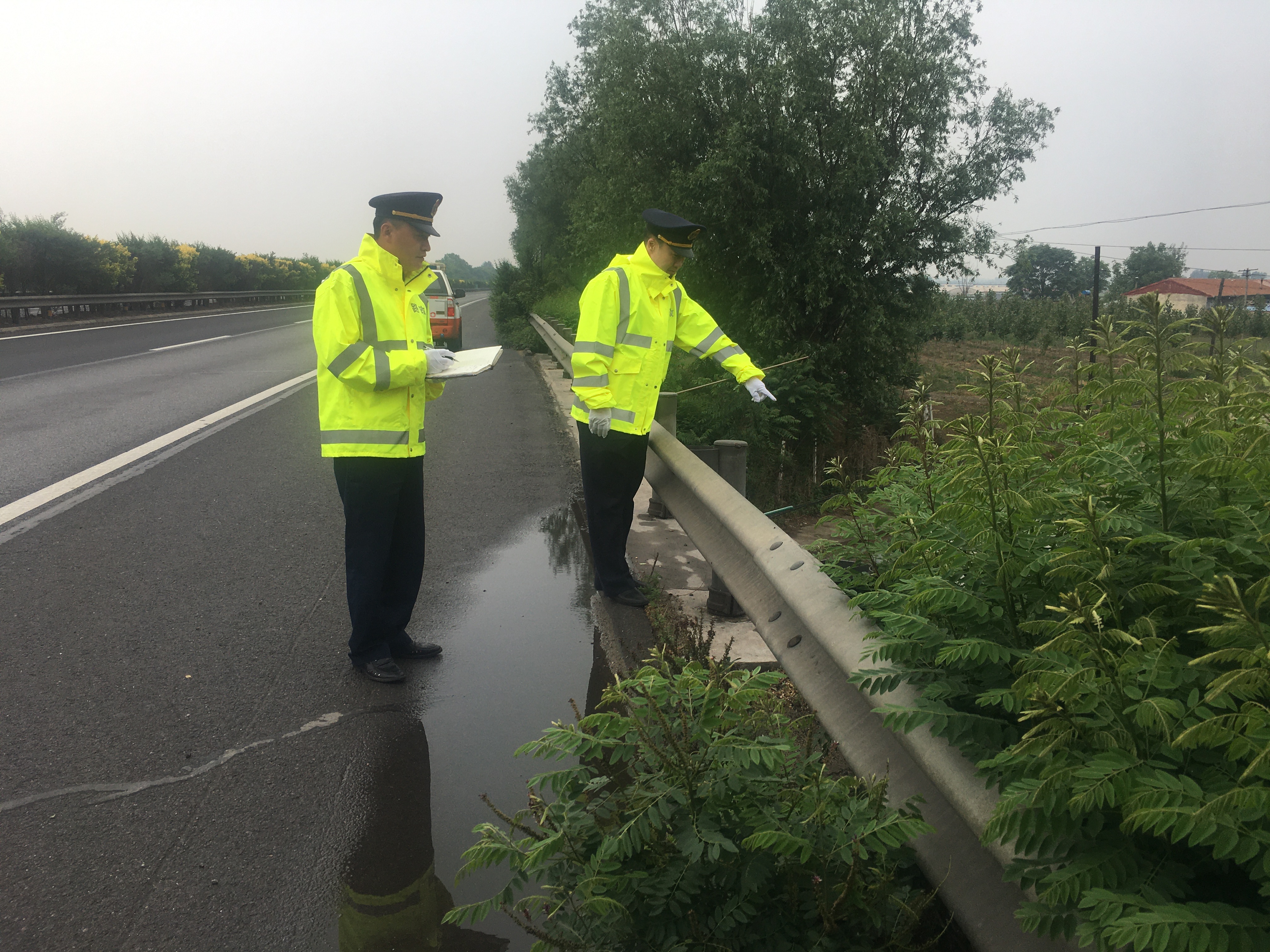 6月2日凌晨至中午时段,唐秦片区普降中雨。当天下午,乐亭大队组织执法人员对辖区的公路设施进行了一次安全排查。