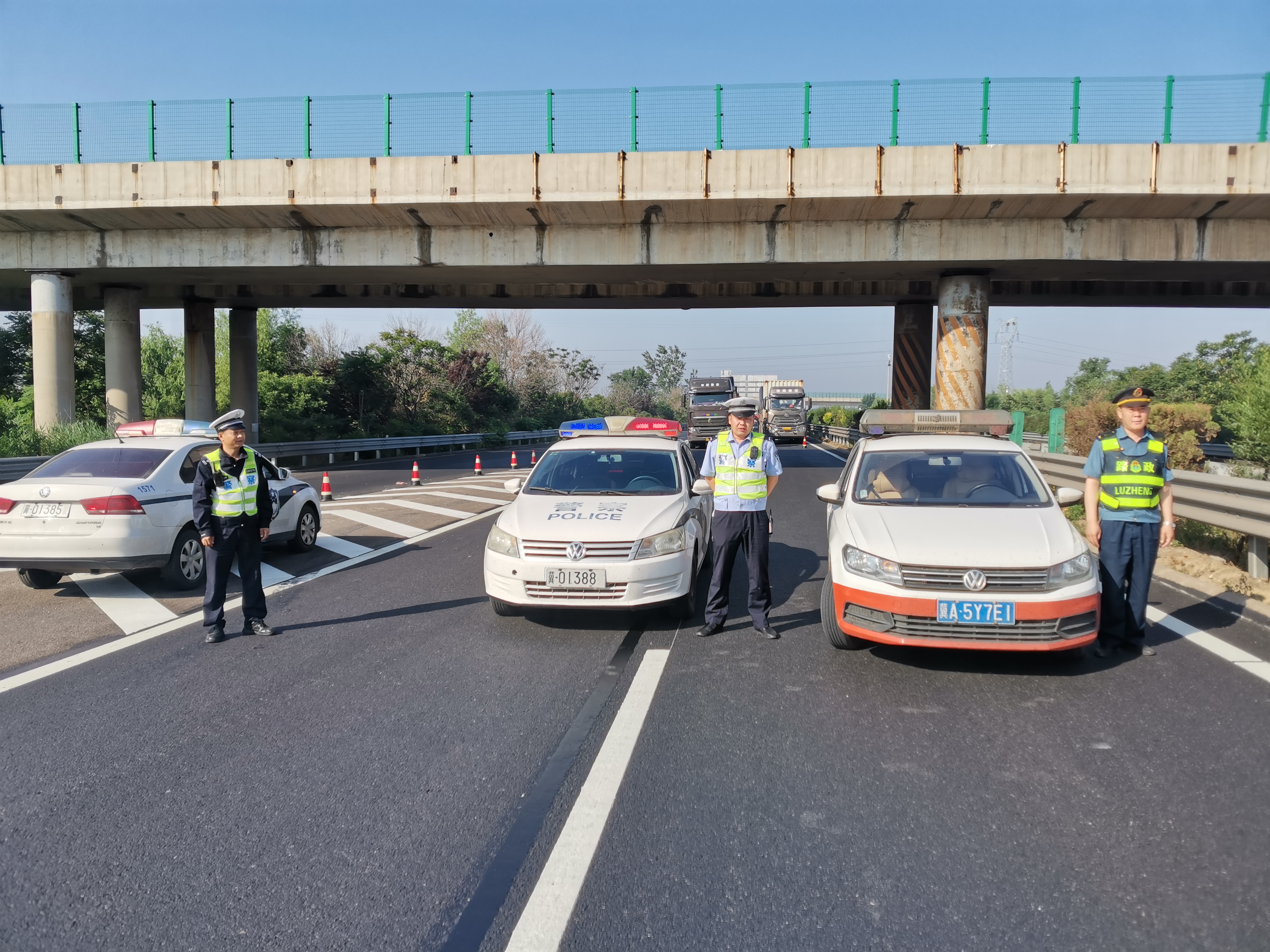 当天凌晨,唐秦地区出现大雾天气能见度不足一百米。3时20分乐亭大队配合高速交警机场大队在沿海高速乐亭东互通对秦皇岛方向车辆进行分流,并对司乘人员就分流的原因、路况、绕行路线等事项进行耐心周到的解答。在天亮后,随着气温的升高和能见度的增长,在6时30分道路具备了压车带道的条件,于是路政大队和高速交警由分流措施改为压车带道的措施,以警报提醒、喊话提示、3辆制式车辆各占一道和车速控制在50公里的方式,在确保安全的前提下,于7时10分将滞留车辆引导出大队管辖路段。